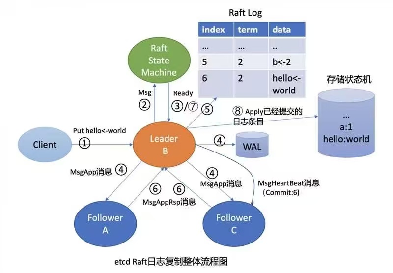 当你发起一个put请求的时候,etcd需通过Raft模块将此请求同步到其他节点,详细流程你可结合下图再次了解下。