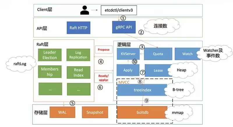 下图是etcd写请求流程的可能导致etcd内存占用较高的核心模块与其数据结构。
