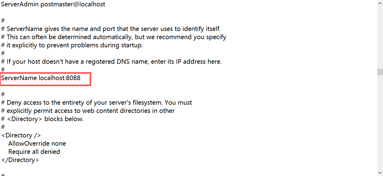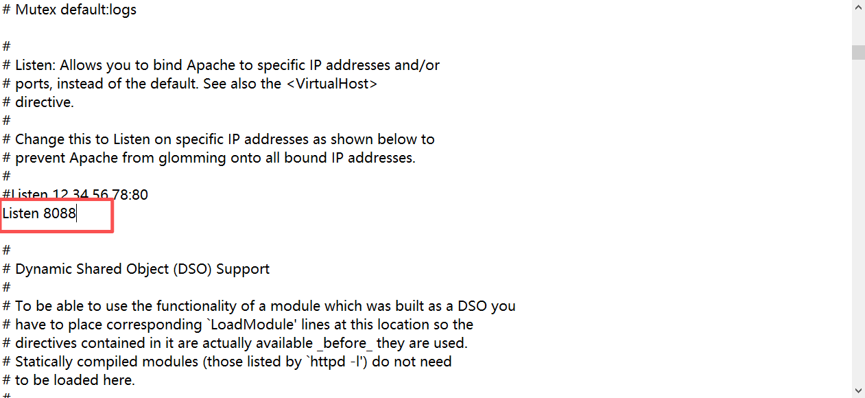 i) 编辑httpd.conf,将Listen 80和ServerName localhost:80改为8088