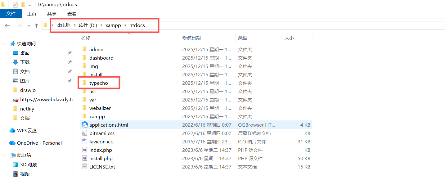 将上面的所有文件和目录复制到 xampp\htdocs 的目录下,注意,是将typecho整个文件夹复制过去。