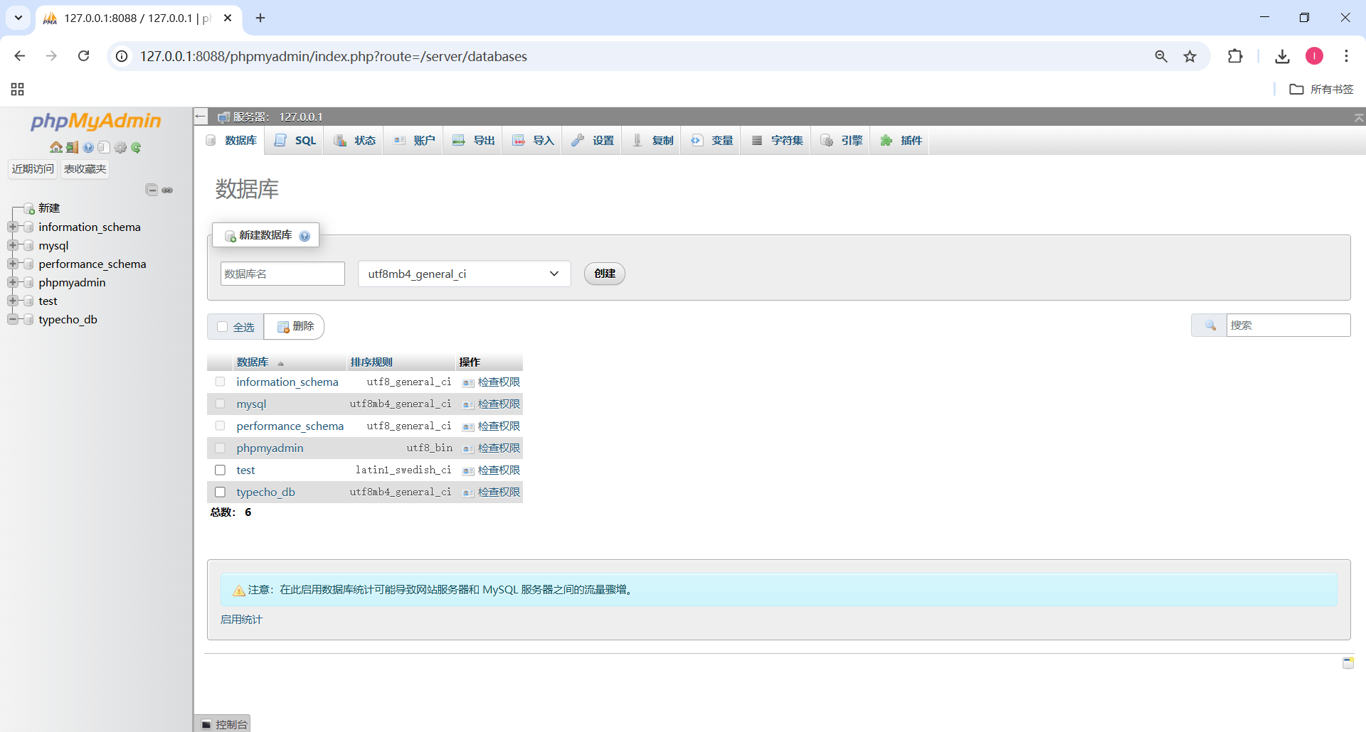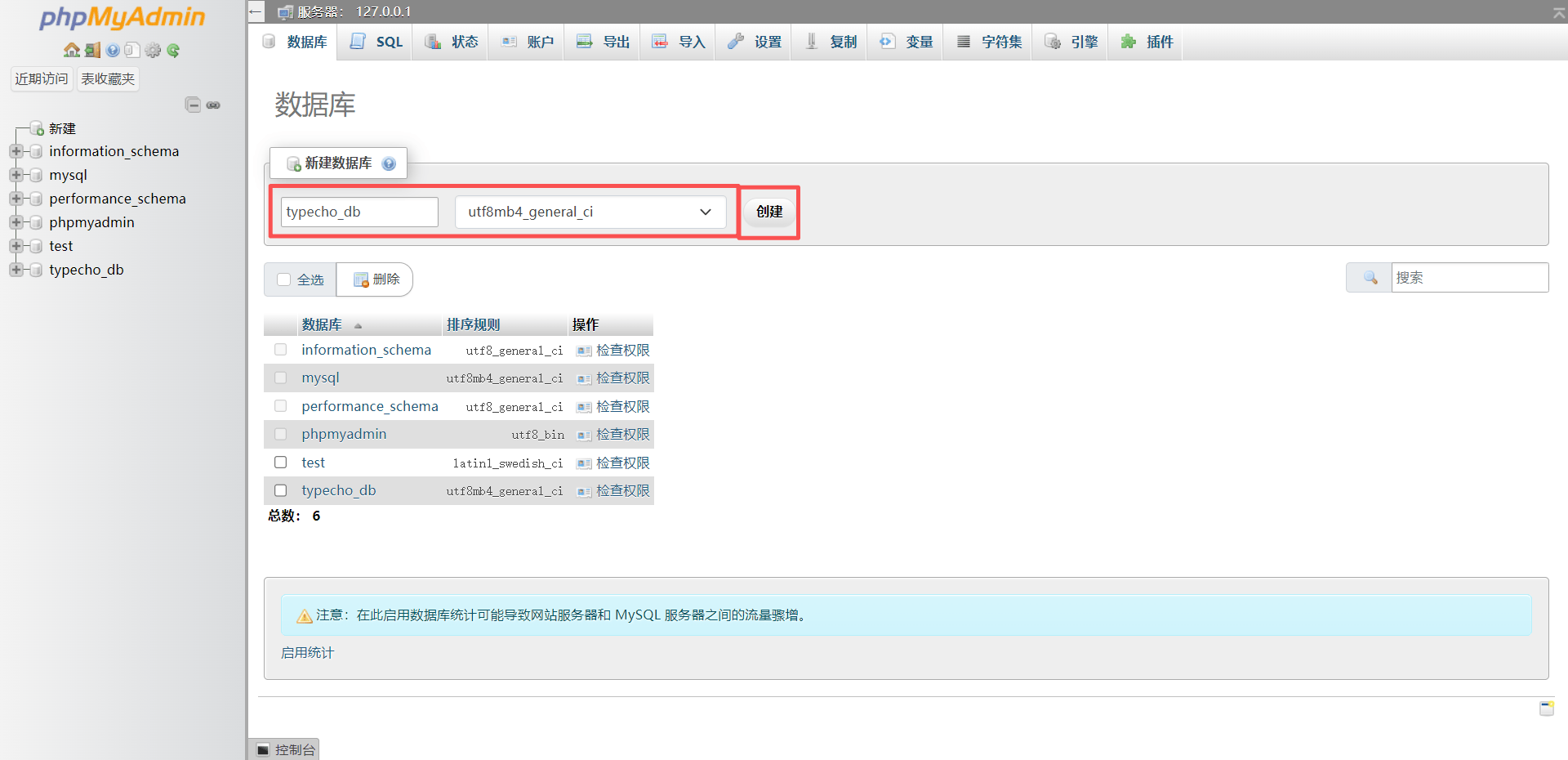 6、 然后在这里增加一个数据库,名称为:typecho_db,然后按照下面的步骤点击创建。