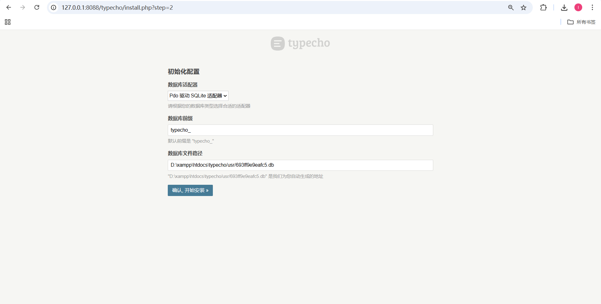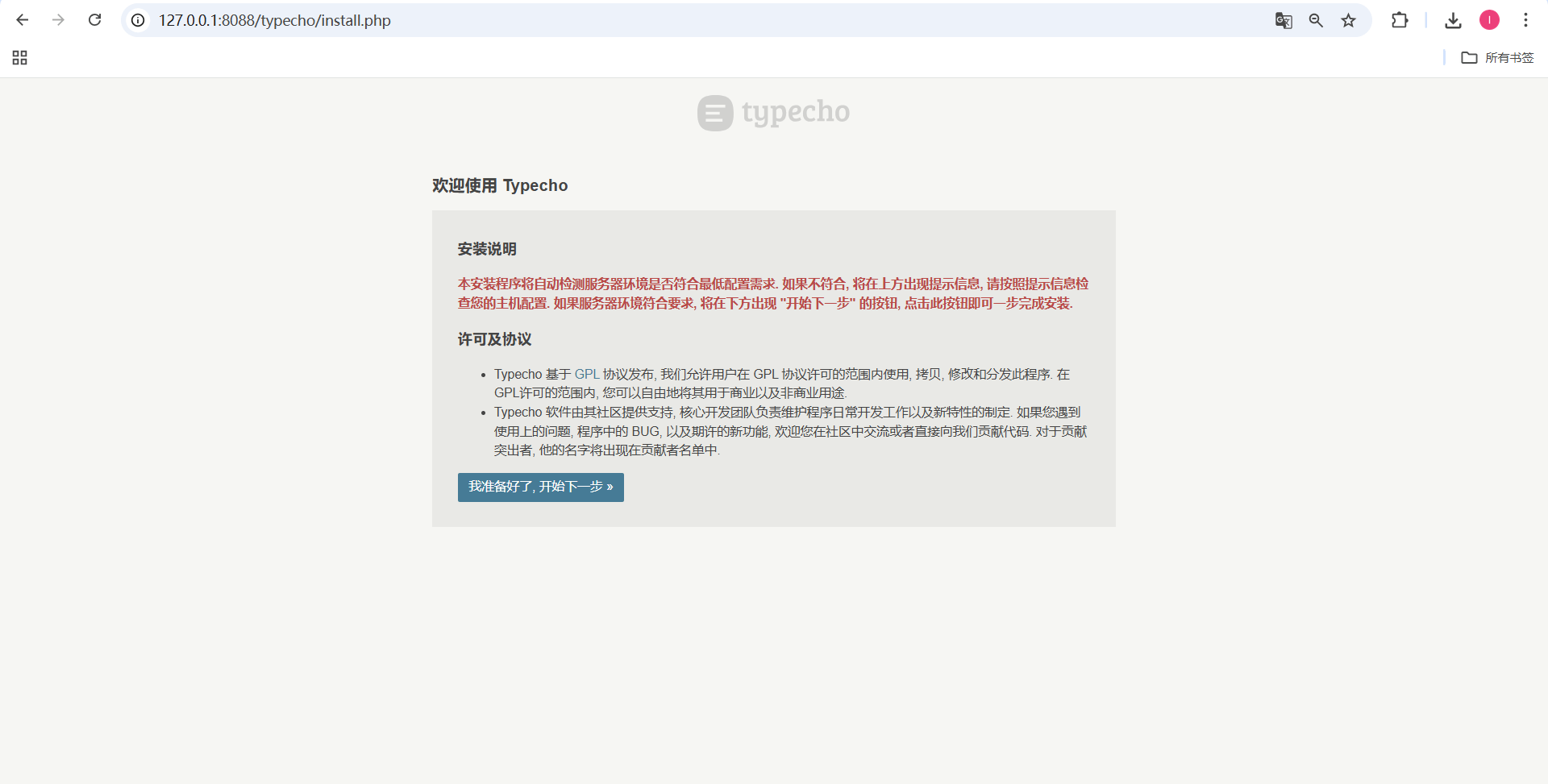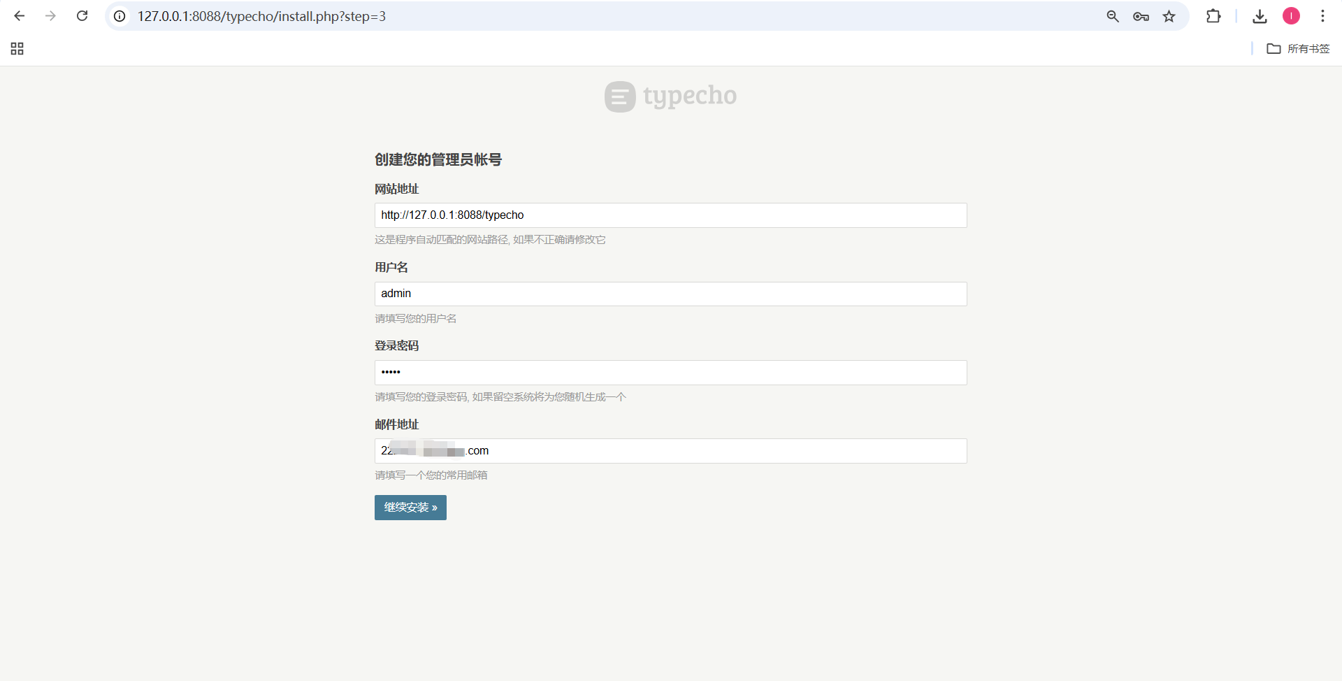 7、 然后在浏览器输入 http://*****:8088/typecho ,访问 Typecho