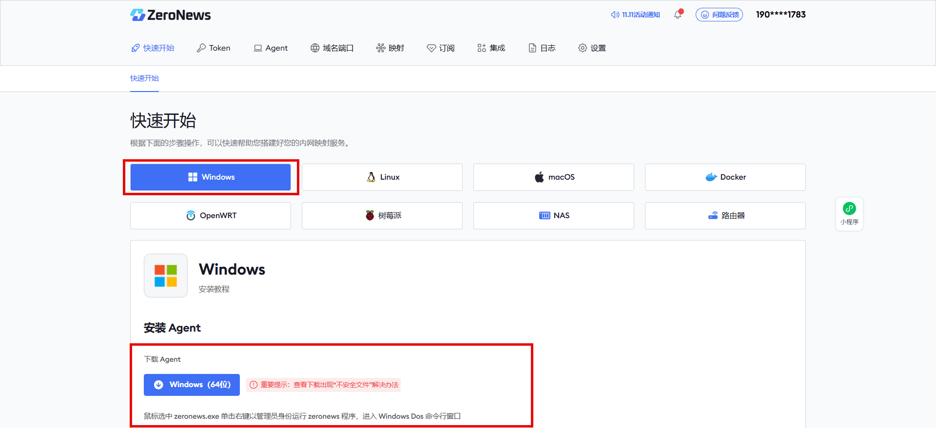 1、 首先,打开 ZeroNews 网站,然后选择您的系统,并按照对应的步骤和命令安装运行 Agent 服务。