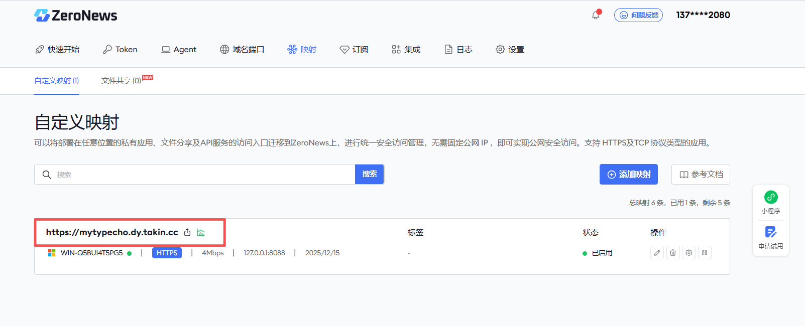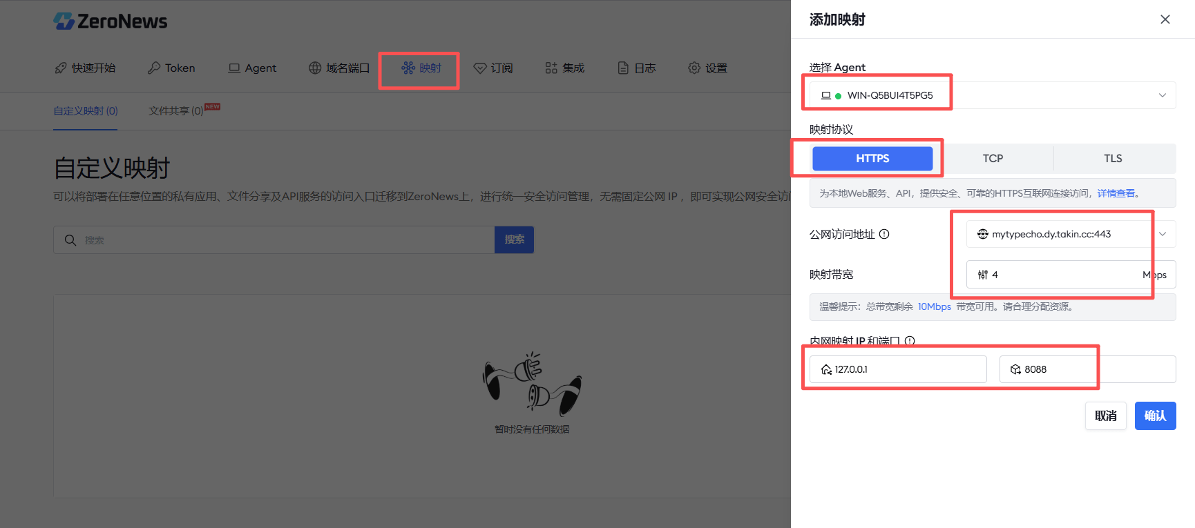 三、 创建 ZeroNews 映射服务