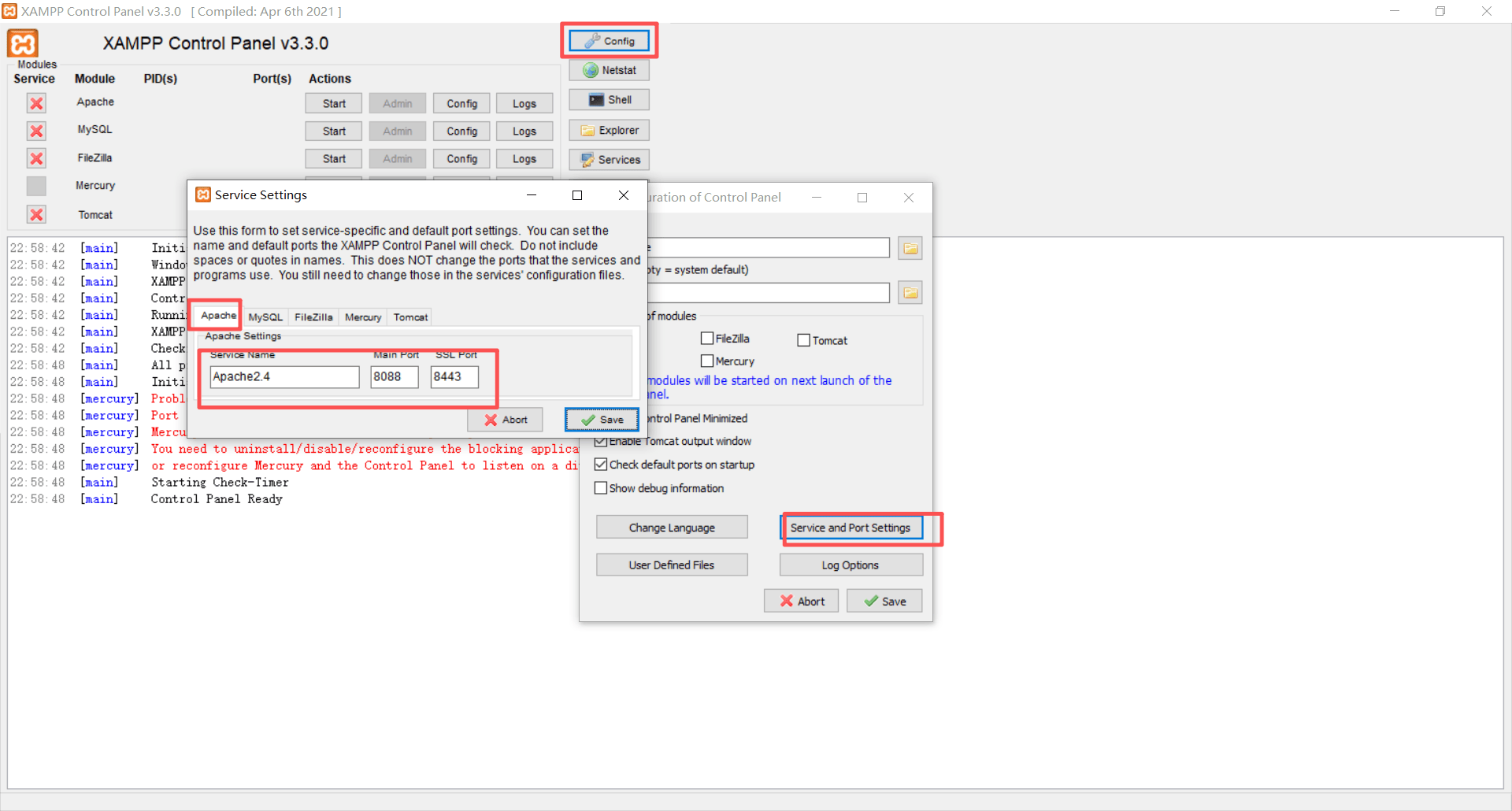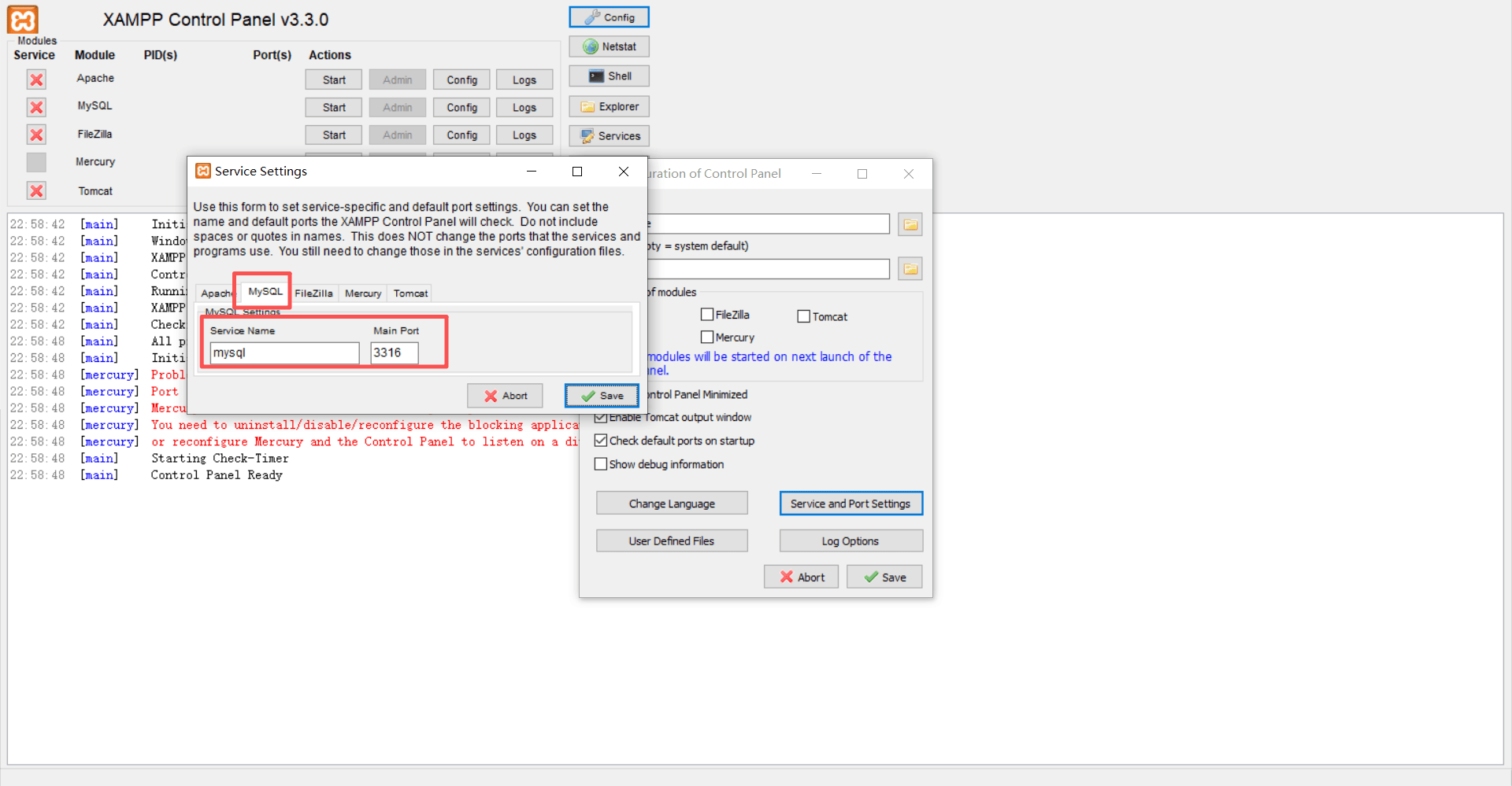 e) 设置 Service and Port Settings