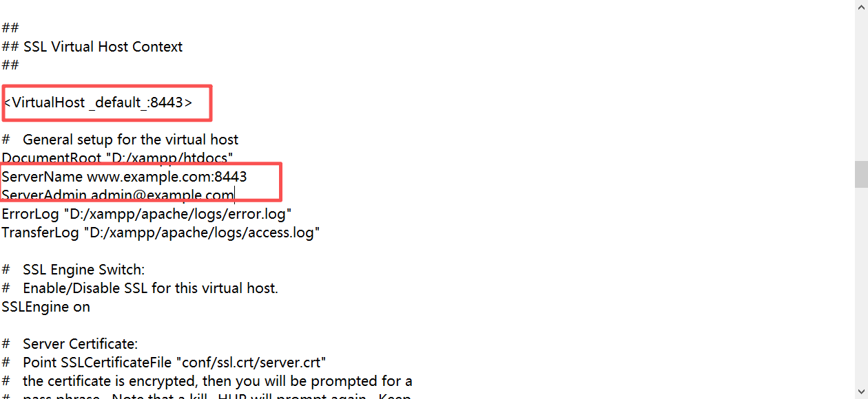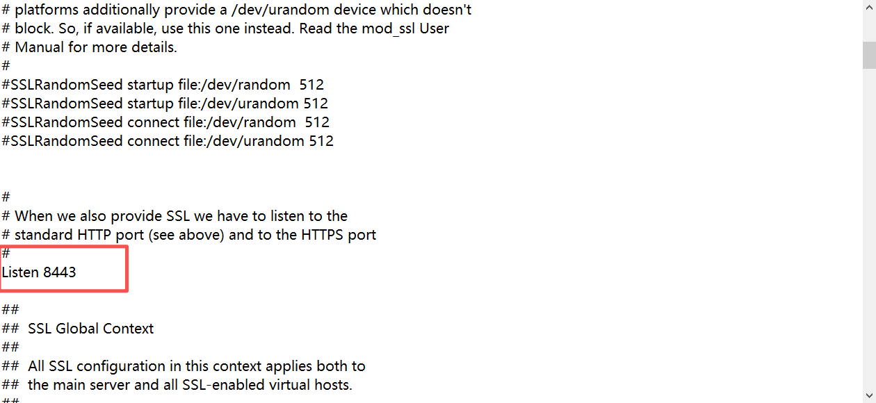 ii) 编辑ssl.conf,将Listen 443改为8443,VirtualHost default 端口 443 更改为 8443。