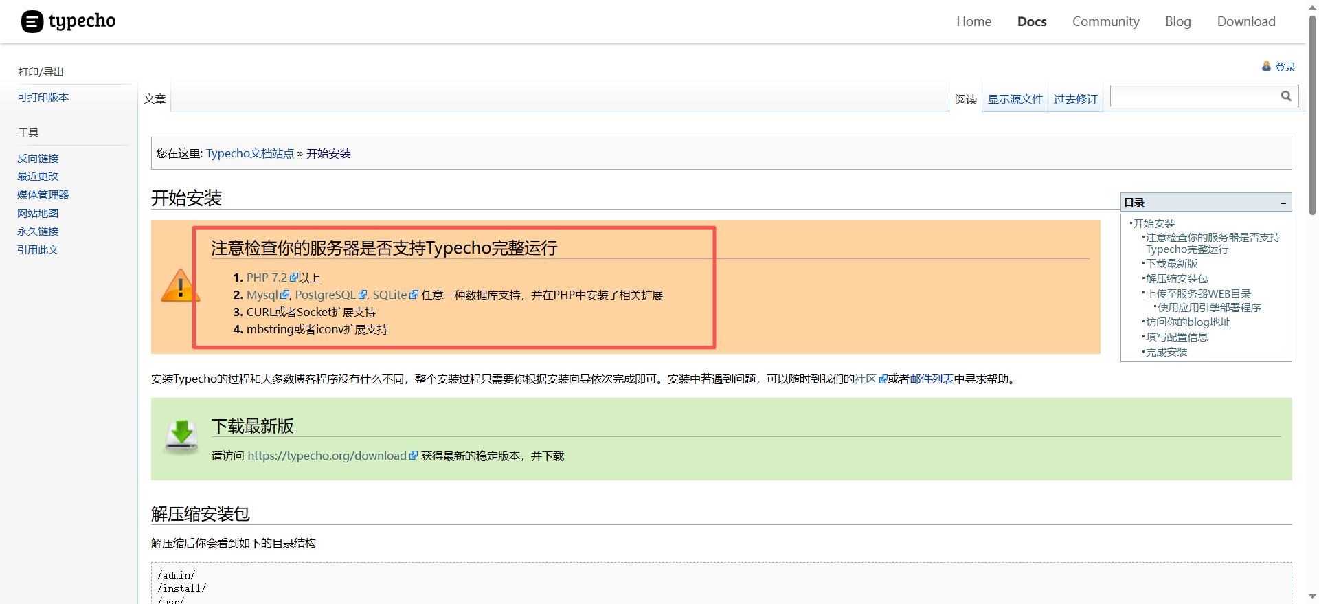 2、 环境要求 ,在安装Typecho前,请确保系统满足以下要求: