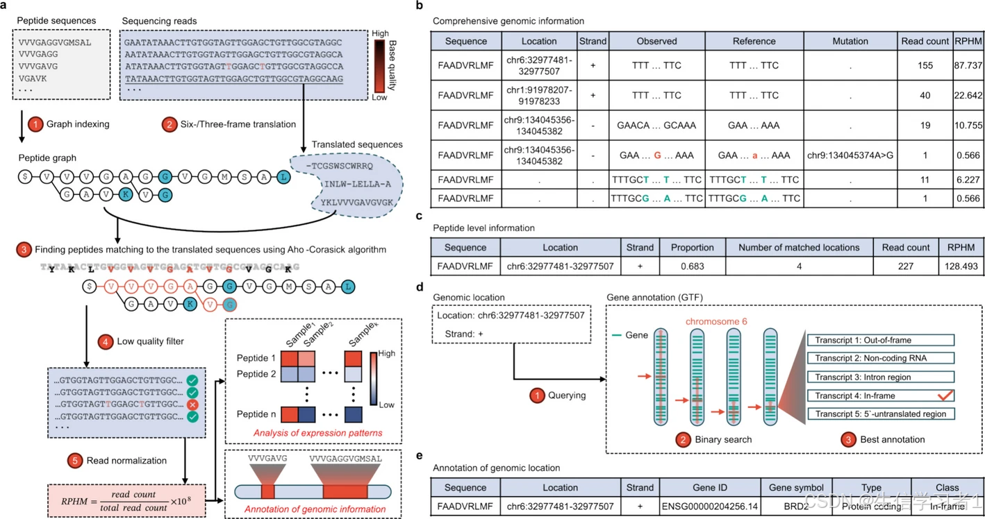 早期基于 RNA 的优先级排序 pMHC 的工作主要依赖于来自癌症基因组图谱(TCGA)[17] 和基因型-组织表达(GTEx)项目[18] 的 mRNA 分析数据,这些数据使得能够对大规模样本中的注释编码基因进行快速评估[19]。然而,这些方法仅限于源自异常表达的常规编码基因的 pMHC。最近,BamQuery [20] 通过利用 STAR 对比器[21] 来生成参考基因组索引并映射反向翻译的肽编码序列,从而改进了肿瘤抗原的优先排序。这种方法可以纳入已知的遗传变异和注释的剪接接头,并根据映射到基因组区域的 RNA 测序读取覆盖率来估计局部 RNA 表达,从而能够更深入地发现各种肿瘤抗原[22]。然而,由于遗传密码的冗余性,反向翻译的复杂性会随着肽长度的增加而呈指数增长,因此这种方法仅适用于短的 MHC-I 肽(8 - 11 个氨基酸),但对于较长的 MHC-II 肽则不切实际,从而只能捕捉免疫肽组的部分视图。此外,对于一类 I 型肽而言,优先选择来自未注释变异体、新剪接接头或人类参考基因组中不存在的序列(如致癌病毒序列)的 pMHC 仍然具有挑战性,这进一步限制了肿瘤抗原优先排序的范围。此外,BamQuery 以及其他工具如 PGx [23] 和 ACTG [24] 严重依赖预先定义的参考基因模型和基因组序列,这使得它们不适用于检测位于假设搜索空间之外的未注释转录本。最后,BamQuery 需要大量的计算资源,即使是单个查询也需要超过 30GB 的内存。