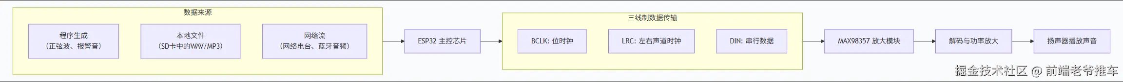 #一、接入 MAX98357 MAX98357 是一款非常流行的 I2S 数字音频放大器模块 ,与 ESP32 搭配是制作数字音频项目的经典组合。控制它的核心在于:正确配置 ESP32 的 I2S 音频接口,并向其发送数字音频数据。为了方便你理解从代码到声音的完整流程,下图清晰地展示了控制 MAX98357 的核心工作流: