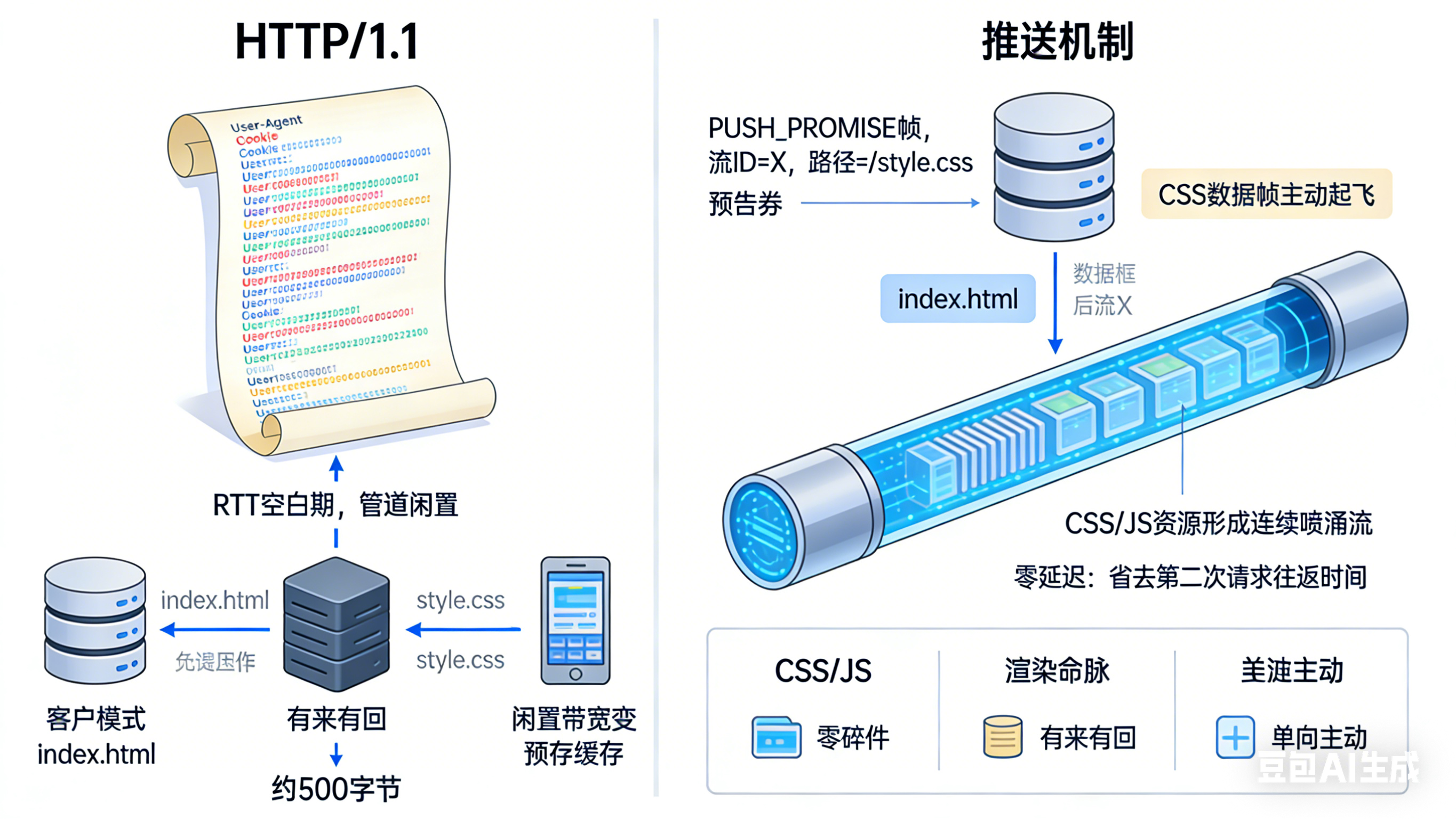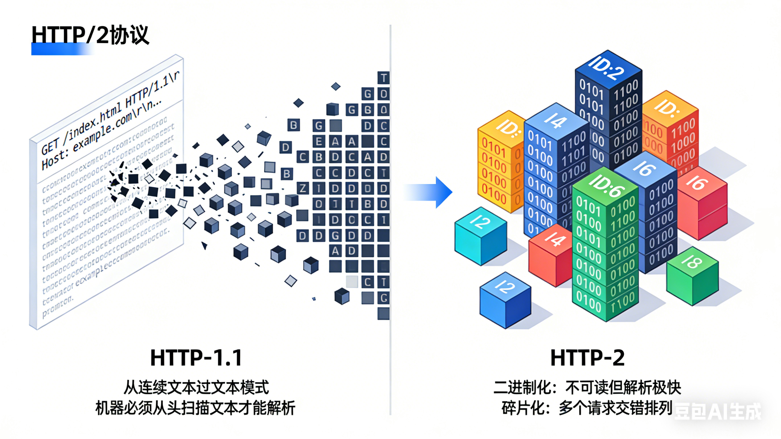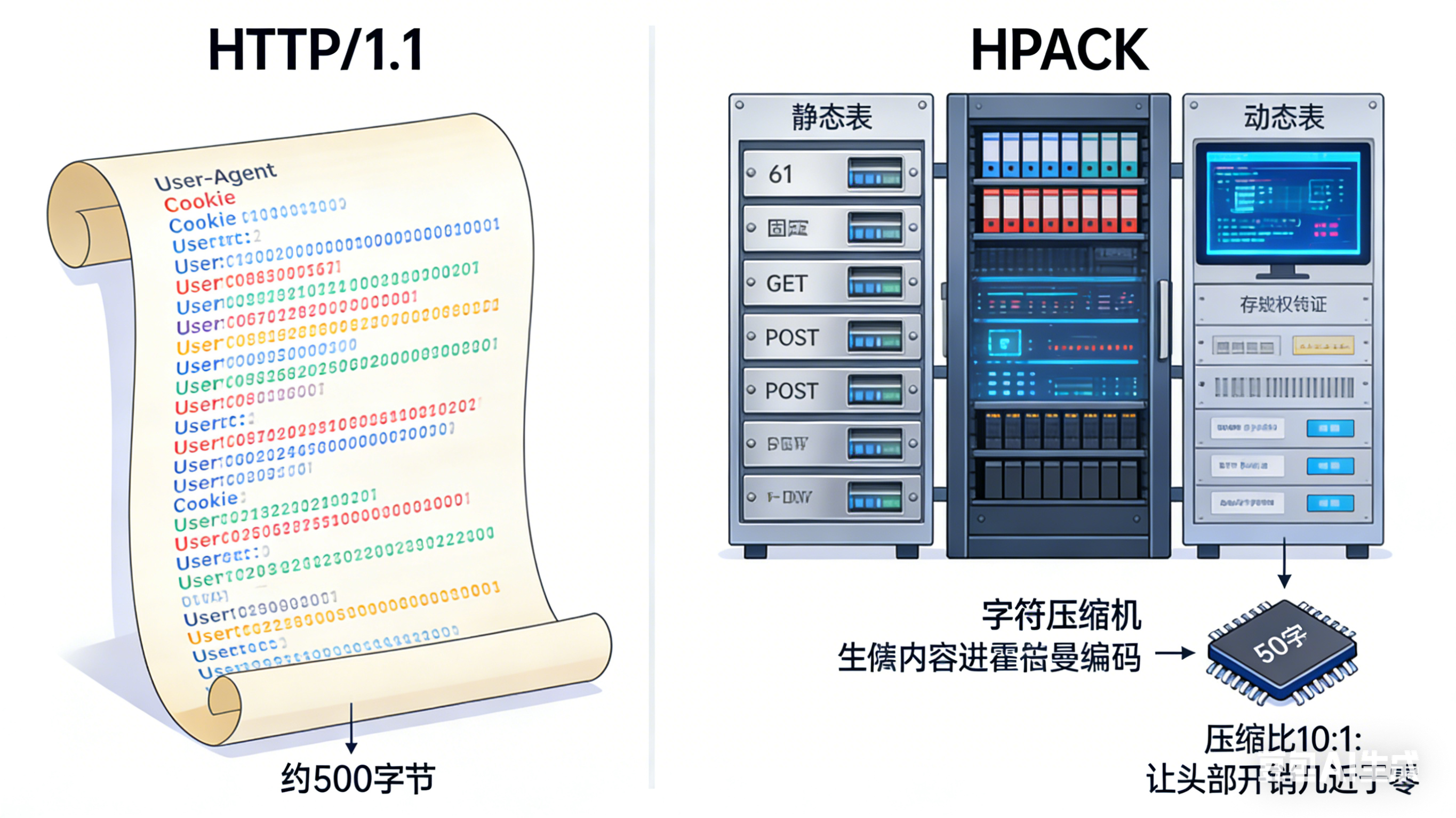| 头部开销 | 每个请求都携带大量重复的头部(Cookie、User-Agent等) | 使用HPACK头部压缩,极大减少了头部大小 |