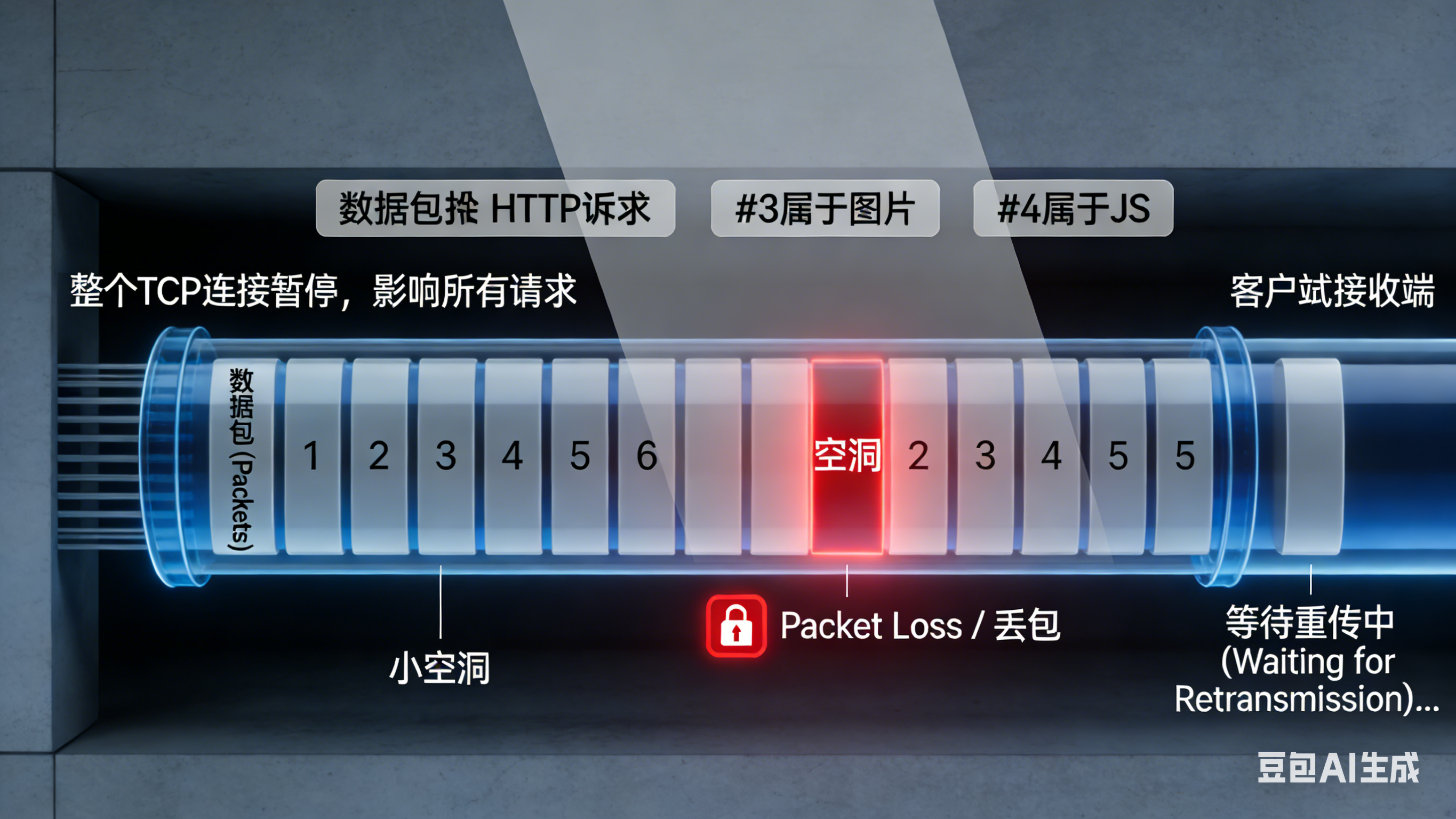 TCP是一个保证顺序、可靠的字节流协议。如果网络传输中丢失了一个TCP数据包,整个连接必须停下来等待这个包重传成功。因为接收方必须按顺序重组字节流才能交给应用层(HTTP/2)。