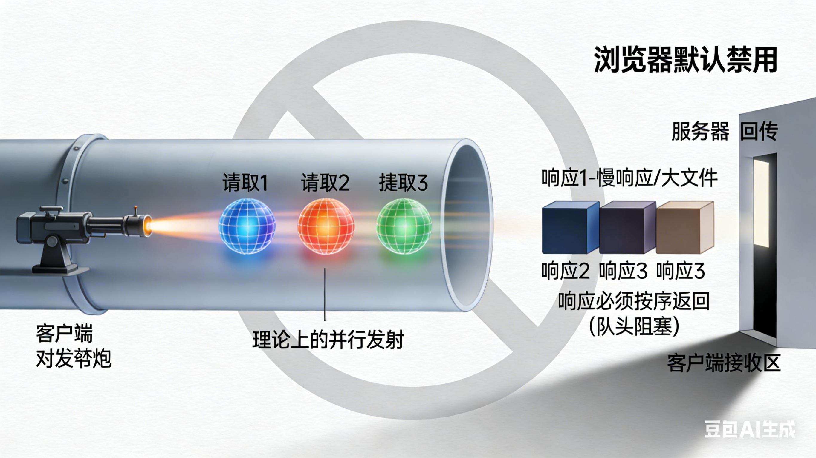 - 请求2(小CSS文件,只需0.1秒)→ 被阻塞,必须等请求1完成
