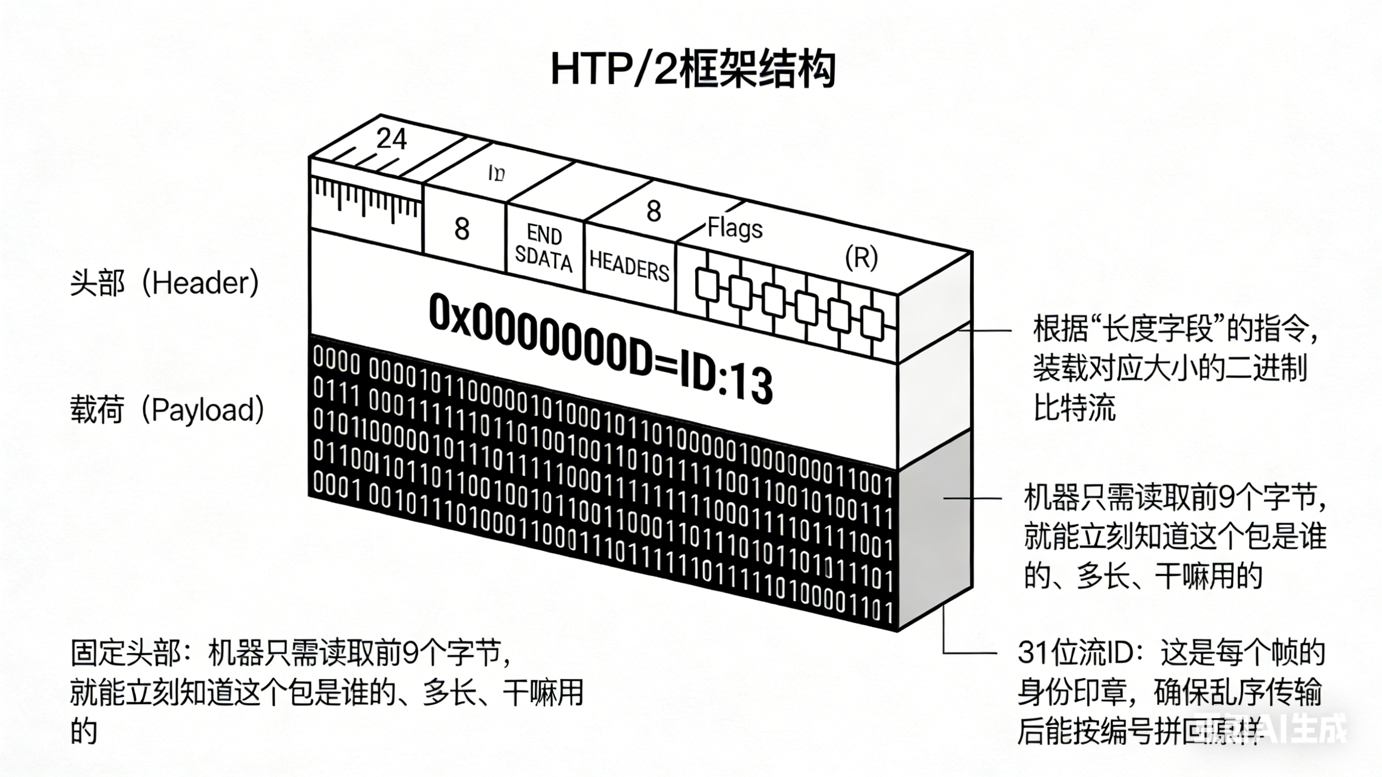简单文本协议:采用 ASCII 编码,像人类对话一样直观(例如:GET /index.html HTTP/1.0)。这种设计方便调试,但对于机器解析来说,必须逐字符处理,性能损耗较高。