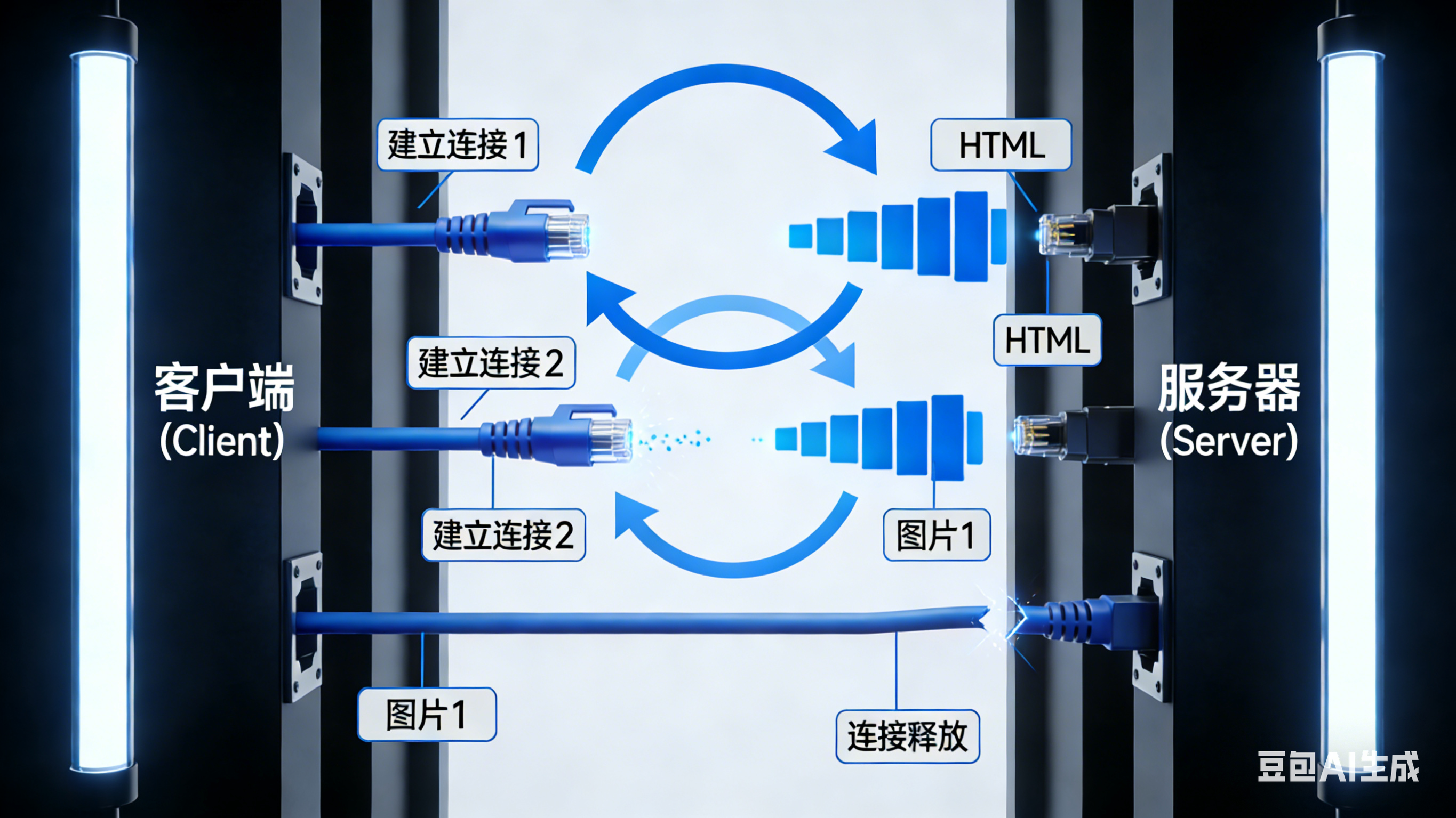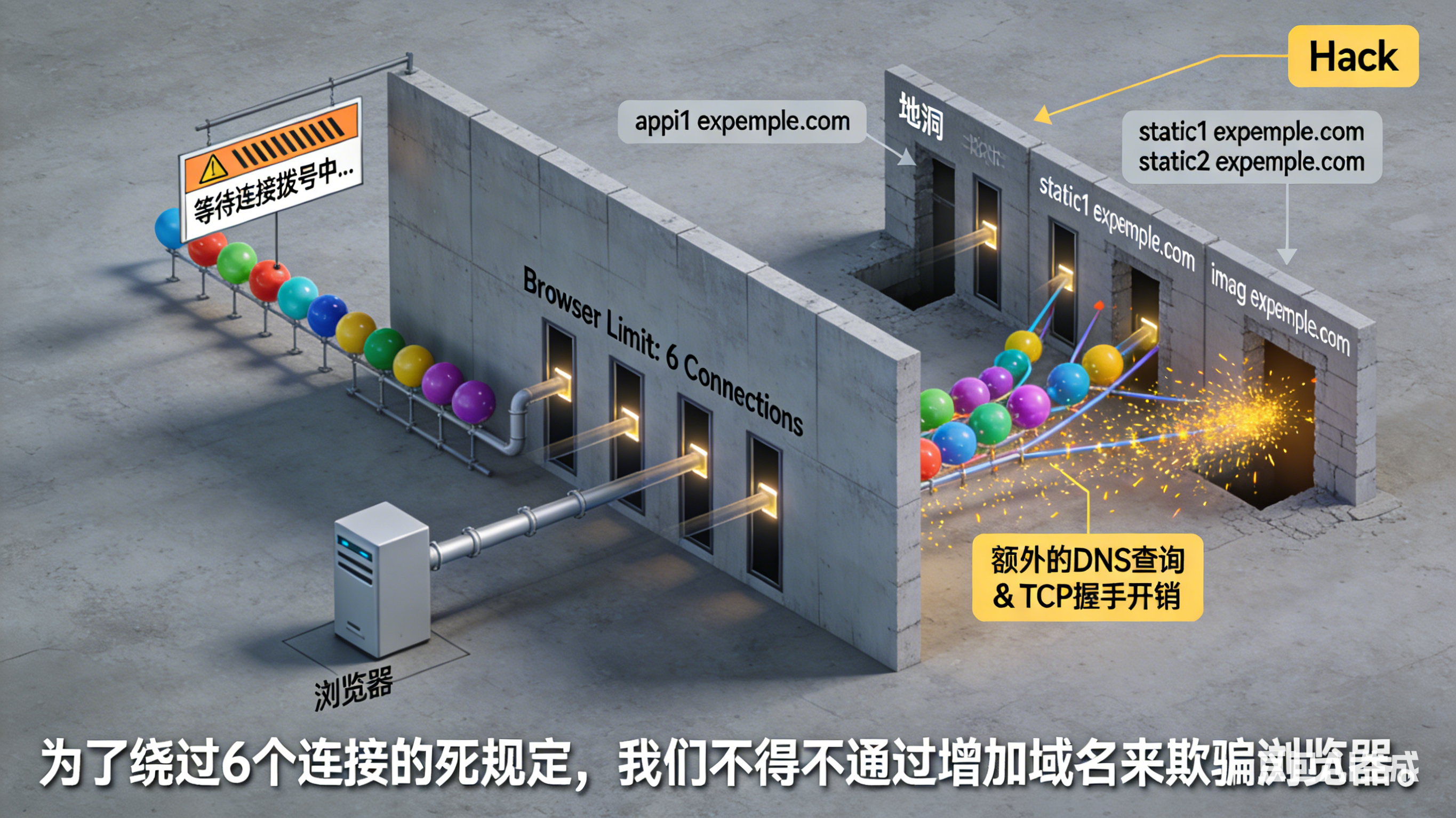 虽然浏览器会为同一个域名打开多个TCP连接(通常是6-8个)来并行下载资源,但这只是权宜之计:
