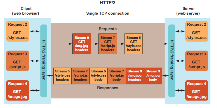 - HTTP/2解决了上述应用层队头阻塞:通过流ID,响应可以乱序返回