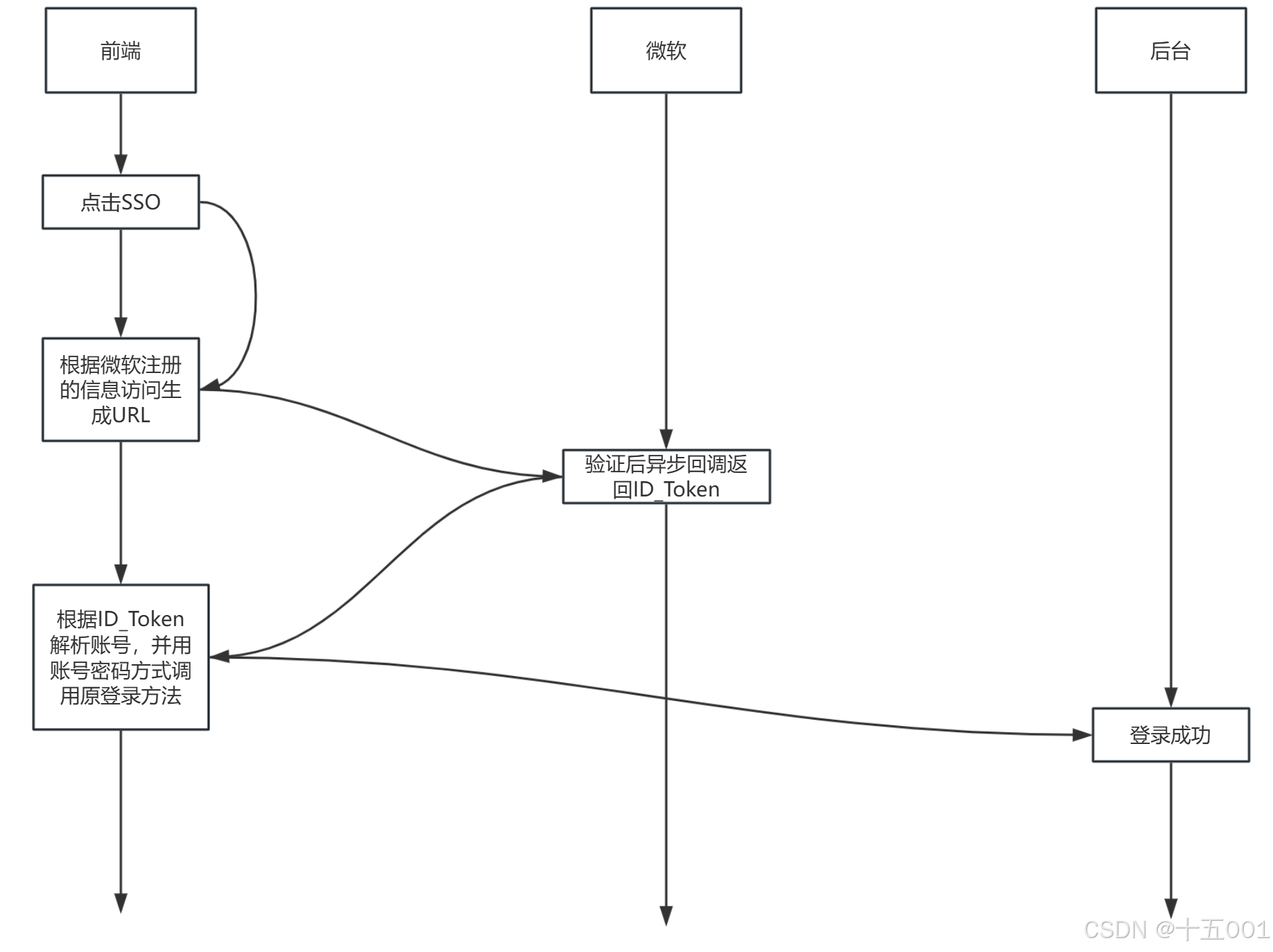 方案很多种,我选择前端登录页面选择SSO登录后到微软进行验证,异步回调后获取账号,使用账号结合默认密码调用原方法进行登录。该方案是局限了对应场景,但是实现很简单,只需要改造下若依的前端就行了。下面是流程图: