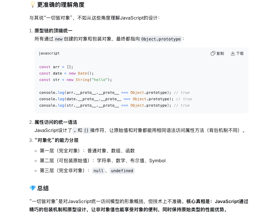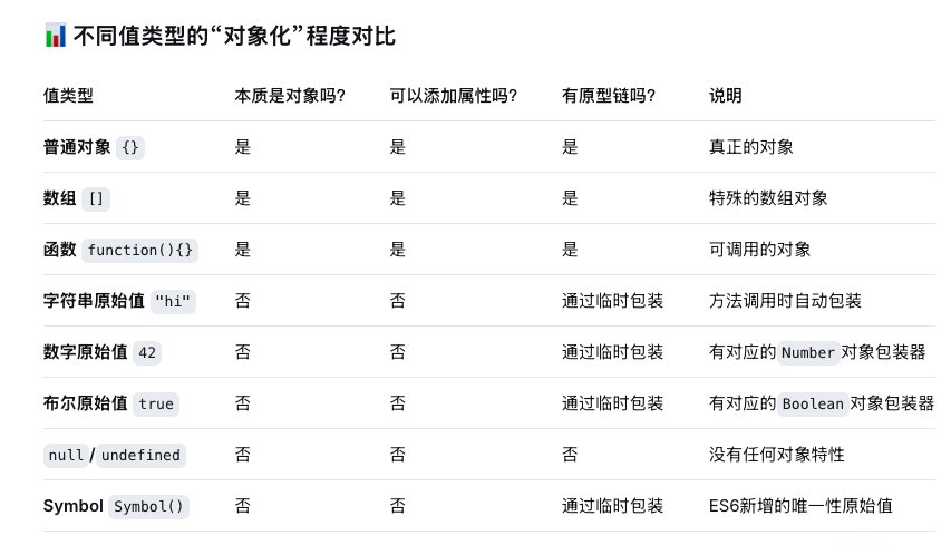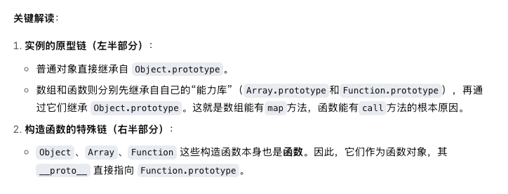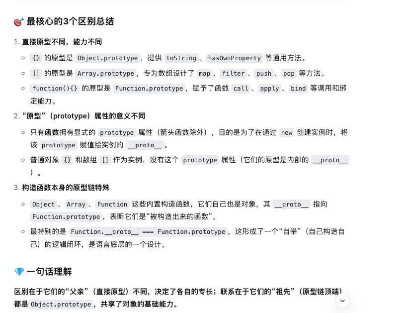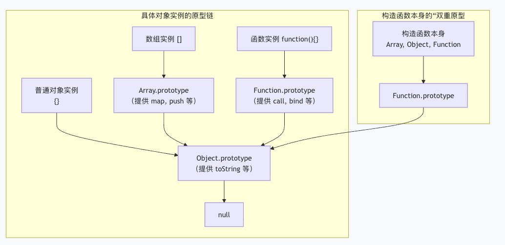 这是一个非常核心的问题。简单来说:普通对象、数组和函数都有不同的直接原型(proto 或 [[Prototype]]),这些原型赋予了它们独特的能力,但最终通过原型链都指向同一个终点------Object.prototype。