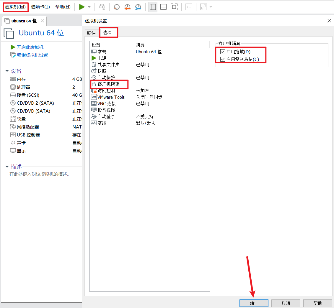 安装完成后,关闭虚拟机,点击【虚拟机】-【设置】-【选项】-【客户机隔离】,勾选"启用拖放"、"启用复制粘贴",然后点击确定后打开虚拟机测试