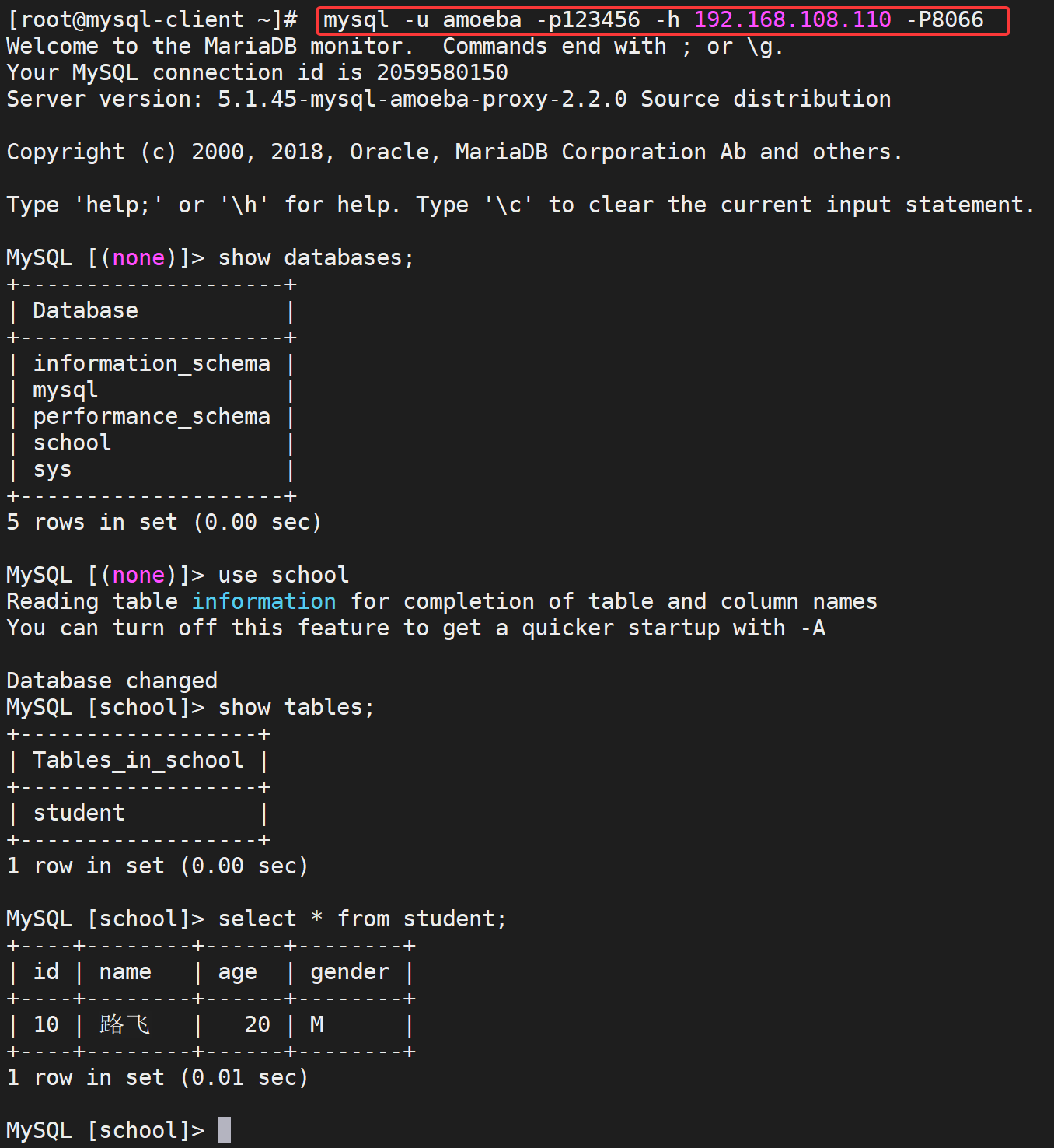mysql -u amoeba -p123456 -h 192.168.108.110 -P8066