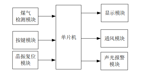 本设计家庭煤气泄漏检测系统,制定了如图2.1所示的系统框图,整个系统包含了STM32单片机最小系统,MQ-4煤气传感器,OLED12864液晶显示器,通风模块,蜂鸣器报警模块等等。在功能上设计如下: