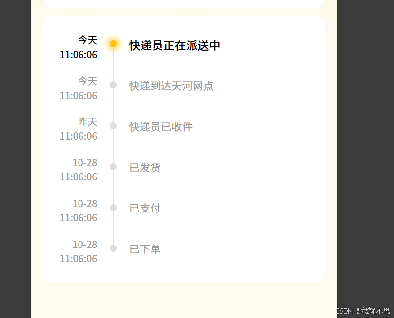 { time: "今天 11:06:06", status: "快递员正在派送中", isCurrent: true },