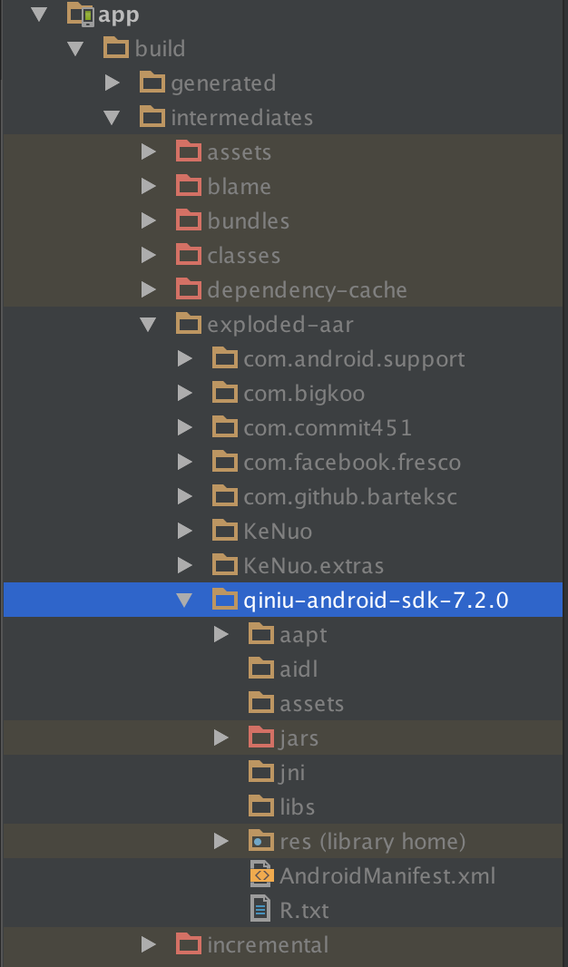 重新同步,编译工程,然后可以在app的build目录下生产对应aar的临时文件,可以看到aar文件中的jar文件,资源文件等,看上去更像是一个解压缩文件夹: