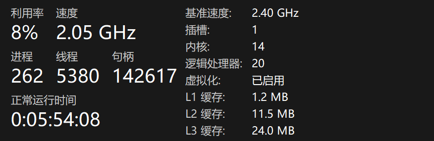 打开任务管理器,点到性能那一栏,这里的基准速度就是基频,达到了2.40GHz;1G 就相当于10^9次方,即10亿。由于 Hz 是代表一秒XX次,所以我的电脑基频则是一秒钟能处理24亿次。睿频则是带有 "速度"的那一栏。