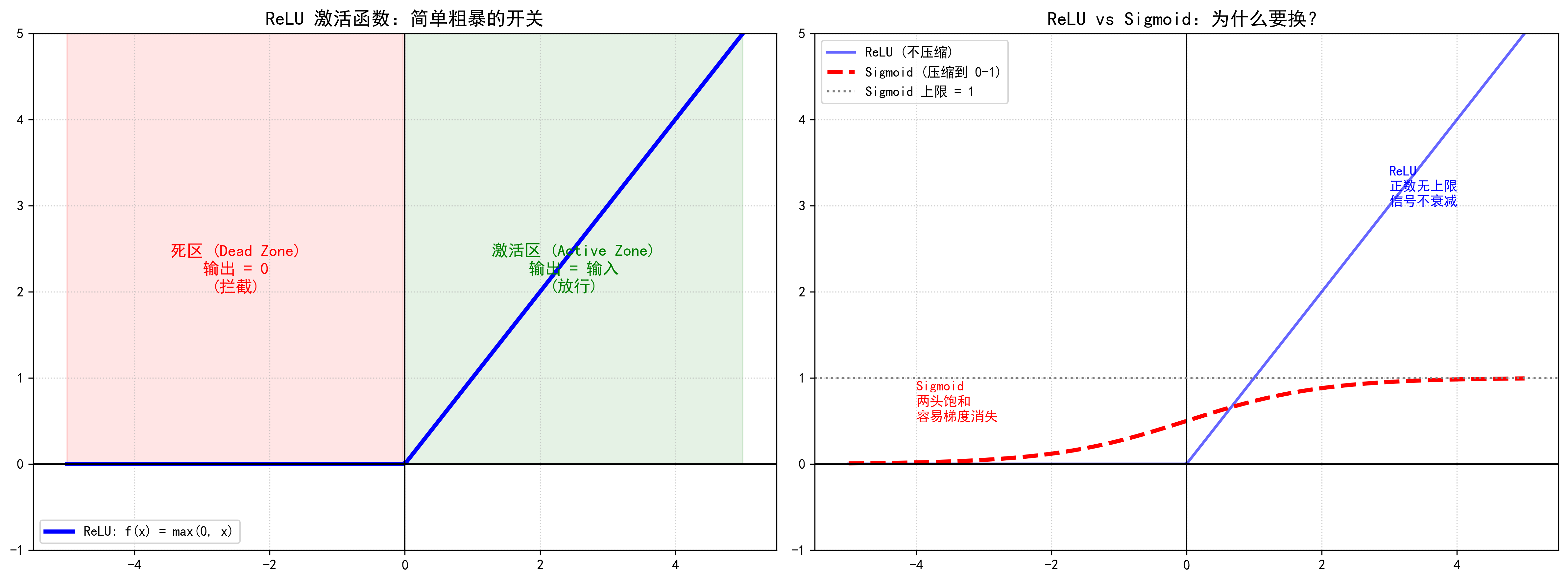 - 右图 (对比):Sigmoid 把信号压缩得很小(红色虚线),而 ReLU 让强信号保持强劲(蓝色实线),这让深层网络更容易训练。
