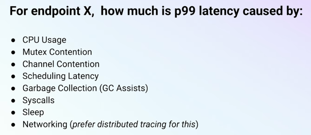 传统的 profile 工具(如 pprof)擅长告诉我们"哪里消耗了资源"或"哪里发生了等待",但它们缺乏上下文 。它们无法告诉我们:这些资源消耗或等待,是如何组合起来,最终构成了一个特定请求的端到端延迟的。