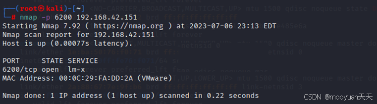 在kali上另起一个终端, 用nmap扫描端口6200,观察端口打开情况,如下所示发现6200端口已经处于open状态。
