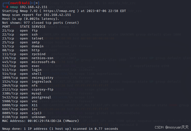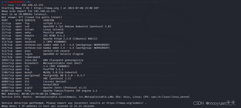 开启metasploitable-linux-2.0.0虚拟机,在kali上打开一个终端,使用kali的nmap对靶机进行端口扫描(命令为:nmap 192.168.42.151),发现靶机开放了21 ftp端口,如下所示。
