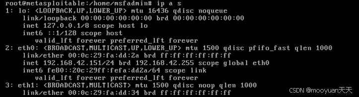 靶机metasploitable-linux-2.0.0的网卡配置与攻击机处于同一网段,获取到的ip地址如下所示,为192.168.42.151。
