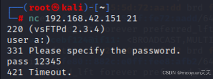 :)(冒号+右括号)。密码可以输入任意字符或直接回车,假设ip地址为192.168.42.135,那么进入如下交互流程。Connected to 192.168.42.135. 220 (vsFTPd 2.3.4) Name (192.168.42.135:user): :) 331 Please specify the password. Password: <任意输入,如 123> 530 Login incorrect. Login failed.注意 :你会看到"Login incorrect."的失败提示,这完全正常且是预期的 。因为我们的目的不是真正登录FTP,而是让服务端处理包含