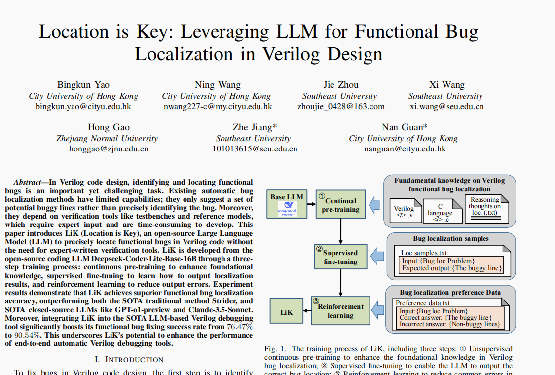 这篇论文介绍了LiK ,一个用于自动定位Verilog功能性bug 的开源LLM模型。LiK通过三步训练:预训练、微调和强化学习,显著提升了bug定位的准确性。通过与现有方法的对比,LiK表现出色,特别是在不依赖专家工具的情况下,它能直接定位bug所在的行。
