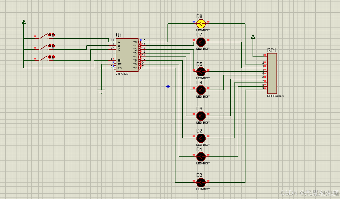 6脚VCC,4,5引脚接地,功能是通过输入端ABC控制输出Y0-Y7