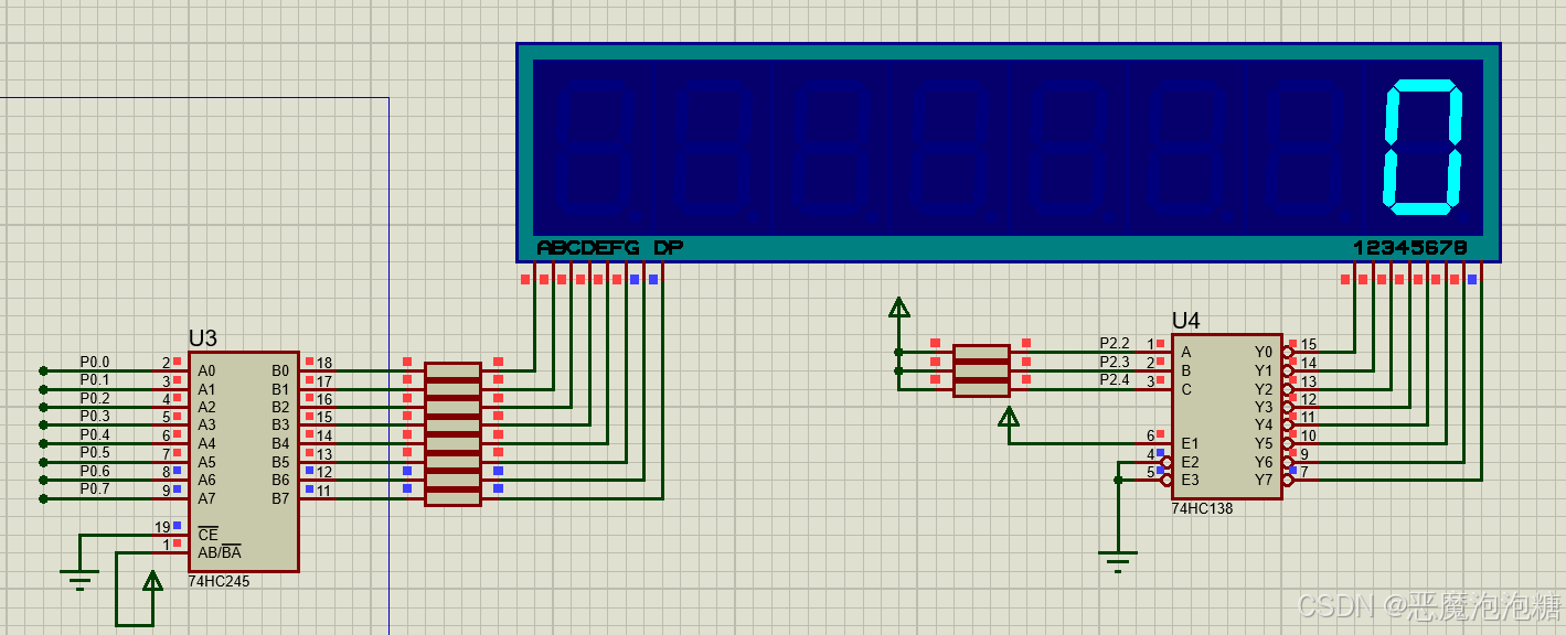 当阳极数码管低电平有效 显示一个数字0,a~g分别接在P0.0-P0.7,对应abcdefg是0000 0011