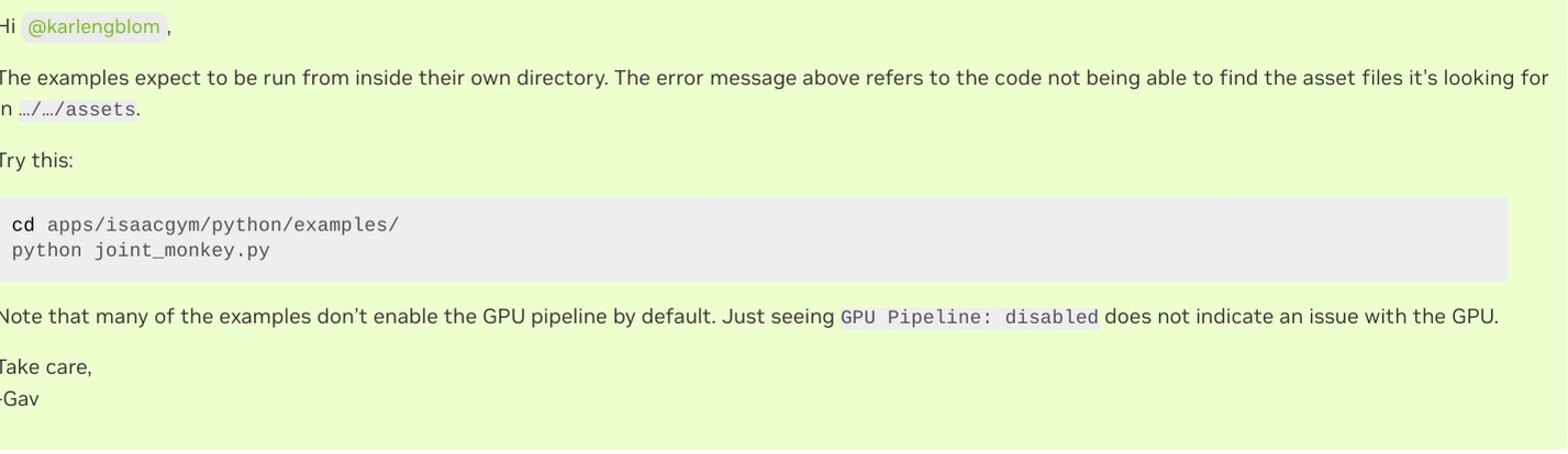本人系统ubuntu 22.04,显卡4070tis,驱动580,cuda12.9。之前用wsl2配置isaacgym无法启用gpu pipeline我认了,今天用原生ubuntu系统总该成功了吧?于是安装vulkan后我就运行了isaacgym的几个示例,都是gpu pipeline disabled。后面翻到一个贴吧才发现是很多例子本身就不支持gpu pipeline,笑飞了😄具体请看图1、图2、图3。如果没注意陷进去了可能就是一天时间被浪费了。