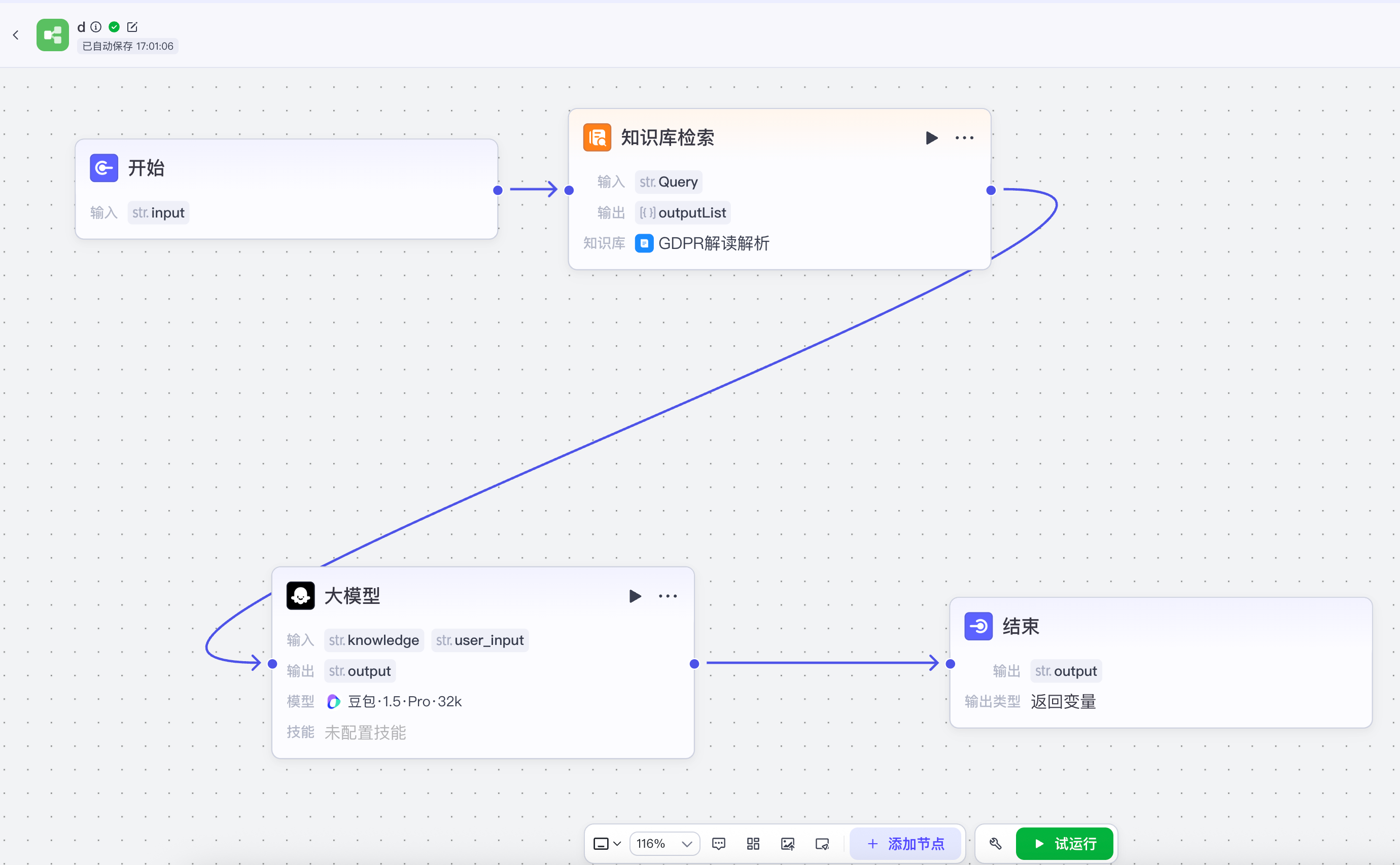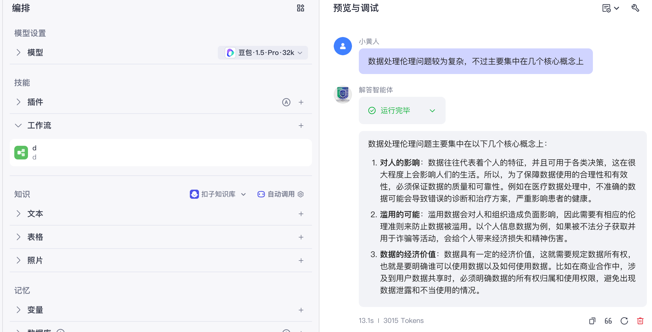 在 扣子 里,我没有做任何花哨的配置,而是走了一条非常标准、也非常可靠的工作流:用户提问 → 检索知识库 → 召回相关片段 → 将问题和召回内容一起交给豆包大模型生成答案。这个流程看起来简单,但它和"直接问模型"的差异是本质性的。