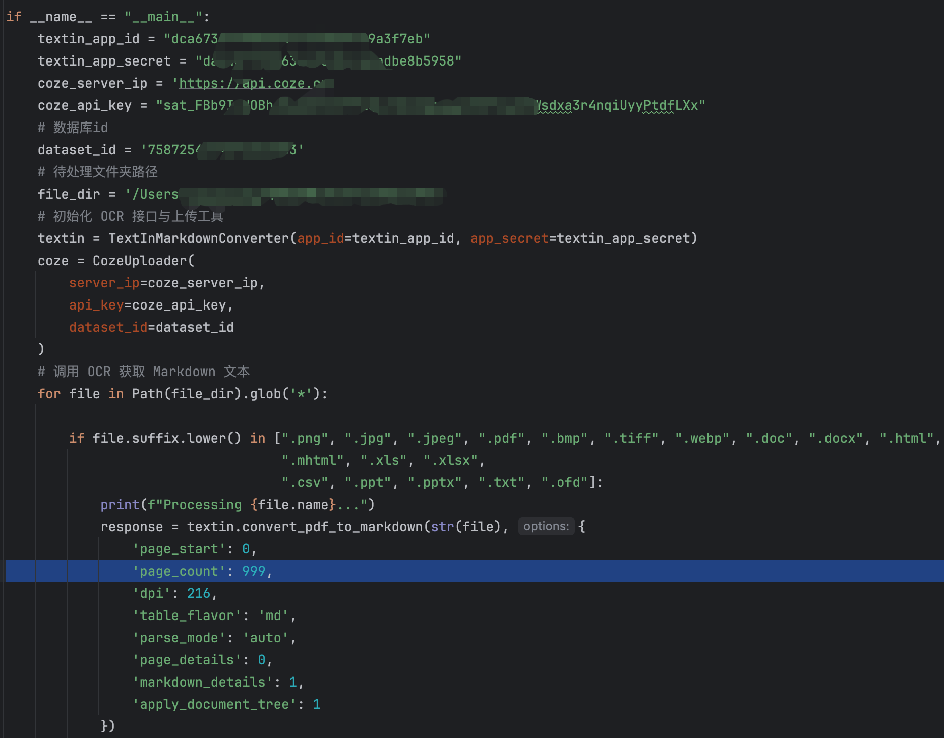 我用 Python 写了一个很简单的脚本,流程非常清晰:读取 PDF → 调用 TextIn 接口 → 拿到 Markdown → 转换为Base64 编码 →作为文件或文本上传到扣子的知识库。整个过程不需要复杂逻辑,更不需要人工介入,非常适合自动化处理。