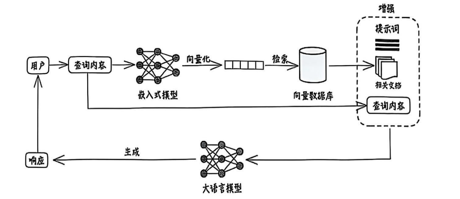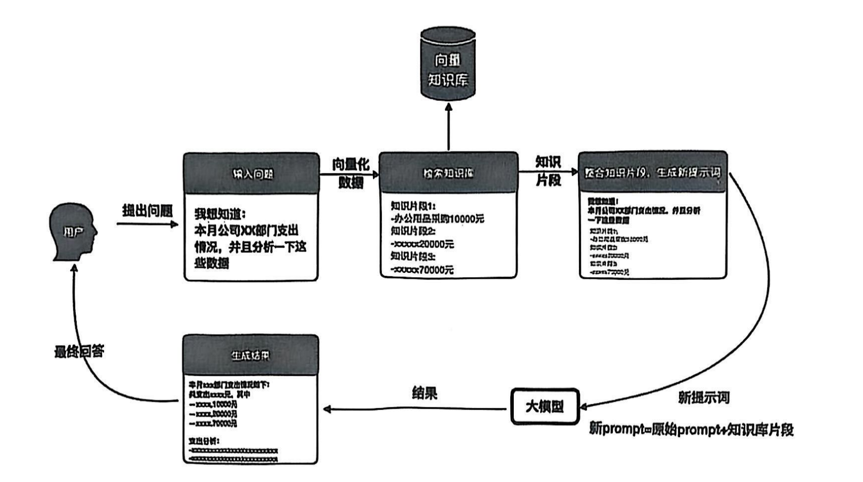 用户输入问题 → 系统从知识库中检索关联信息 → 将问题和检索信息结合成提示词 → 大模型生成答案 → 返回结果给用户。