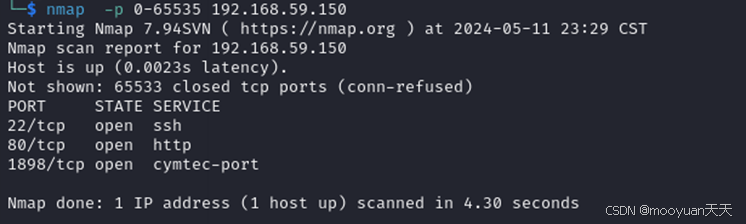 在Kali的终端使用nmap对靶机进行端口扫描,发现靶机开放了1898端口