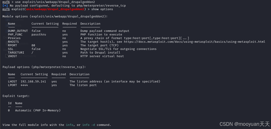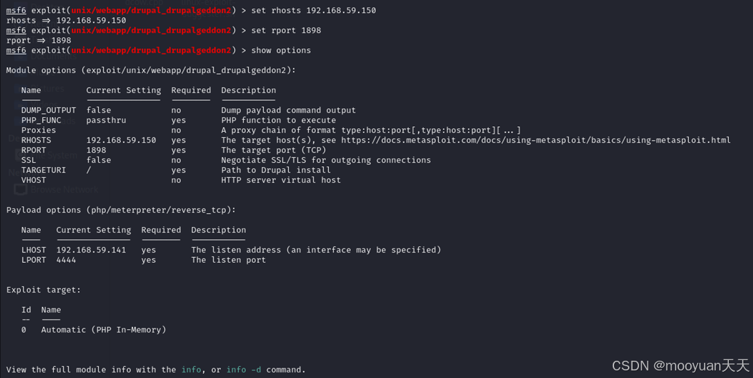 选择2018年的漏洞(exploit/unix/webapp/drupal_drupalgeddon2),它是Metasploit框架中用于利用Drupal CMS高危漏洞的攻击模块。该模块针对CVE-2018-7600(又称Drupalgeddon 2)漏洞,该漏洞源于Drupal 8.x/7.x版本对表单API的输入验证不足,允许远程攻击者在未授权的情况下执行任意PHP代码,从而完全接管网站服务器。接下来显示配置选项,如下所示包括RHOSTS和RPORT。