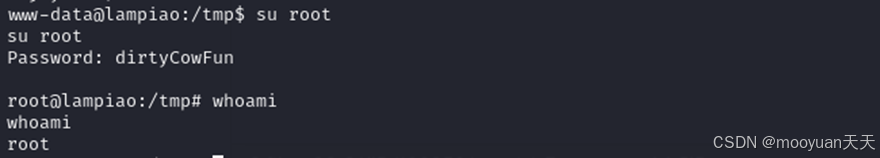 执行su root操作,命令如下所示,直接提示了密码为dirtyCowFun,此时再次执行whoami,已经提示当前用户为root,成功由www-data用户提权为root用户,渗透成功。