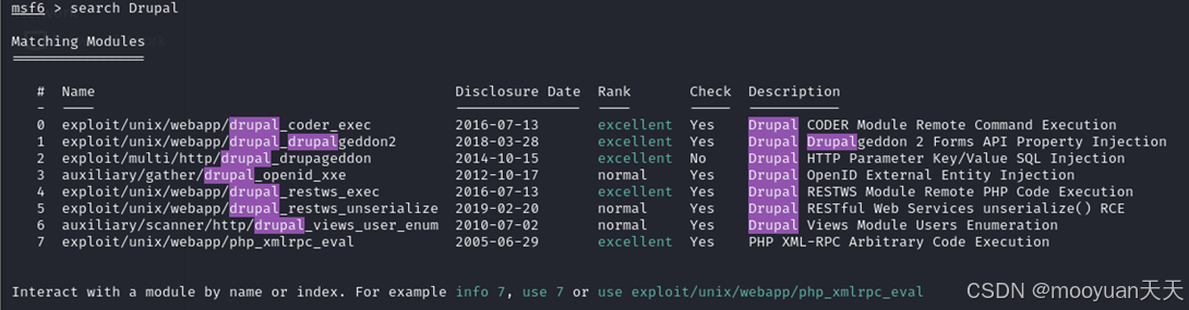 查询drupal漏洞利用模块,共有8个,如下所示。