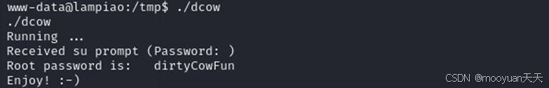交互式终端中执行dcow脏牛渗透程序(./dcow),如下所示。