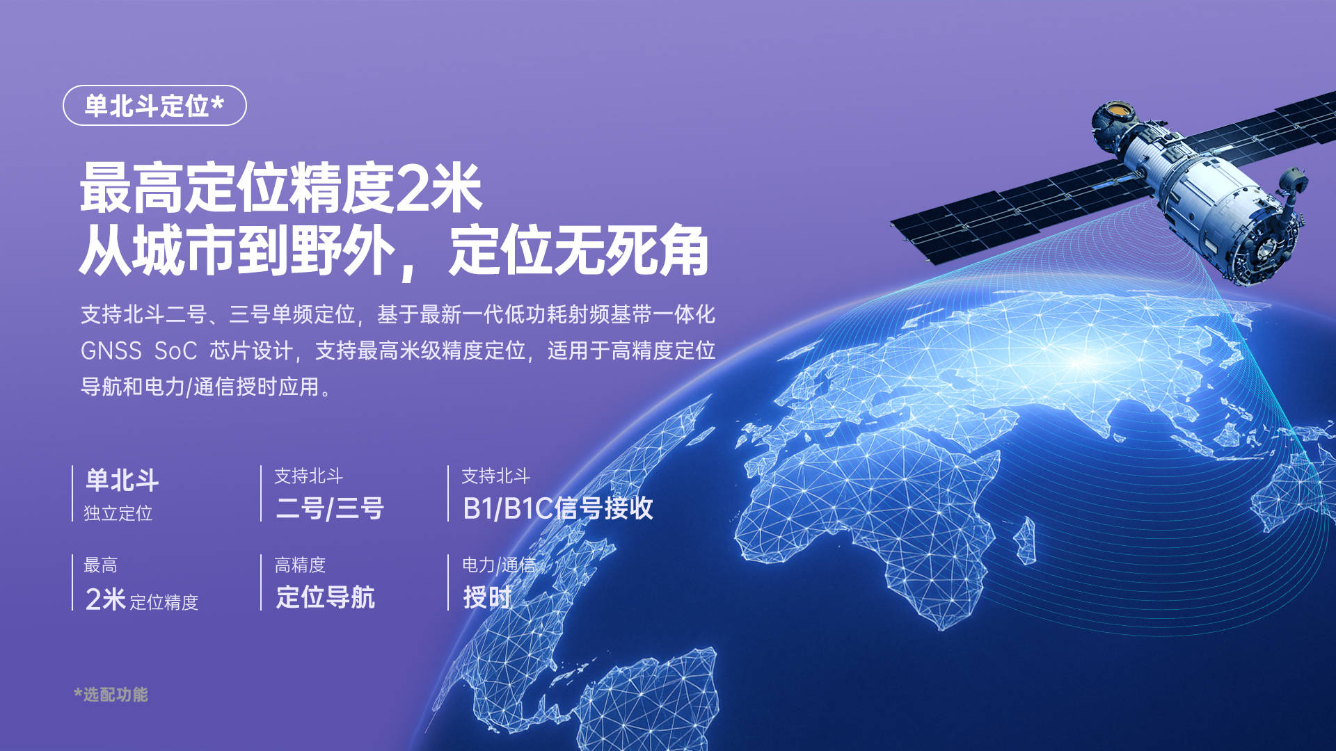 支持北斗二号、三号单频定位,基于最新一代低功耗射频基带一体化GNSS SoC 芯片设计,支持最高米级精度定位,适用于高精度定位导航和电力/通信授时应用。