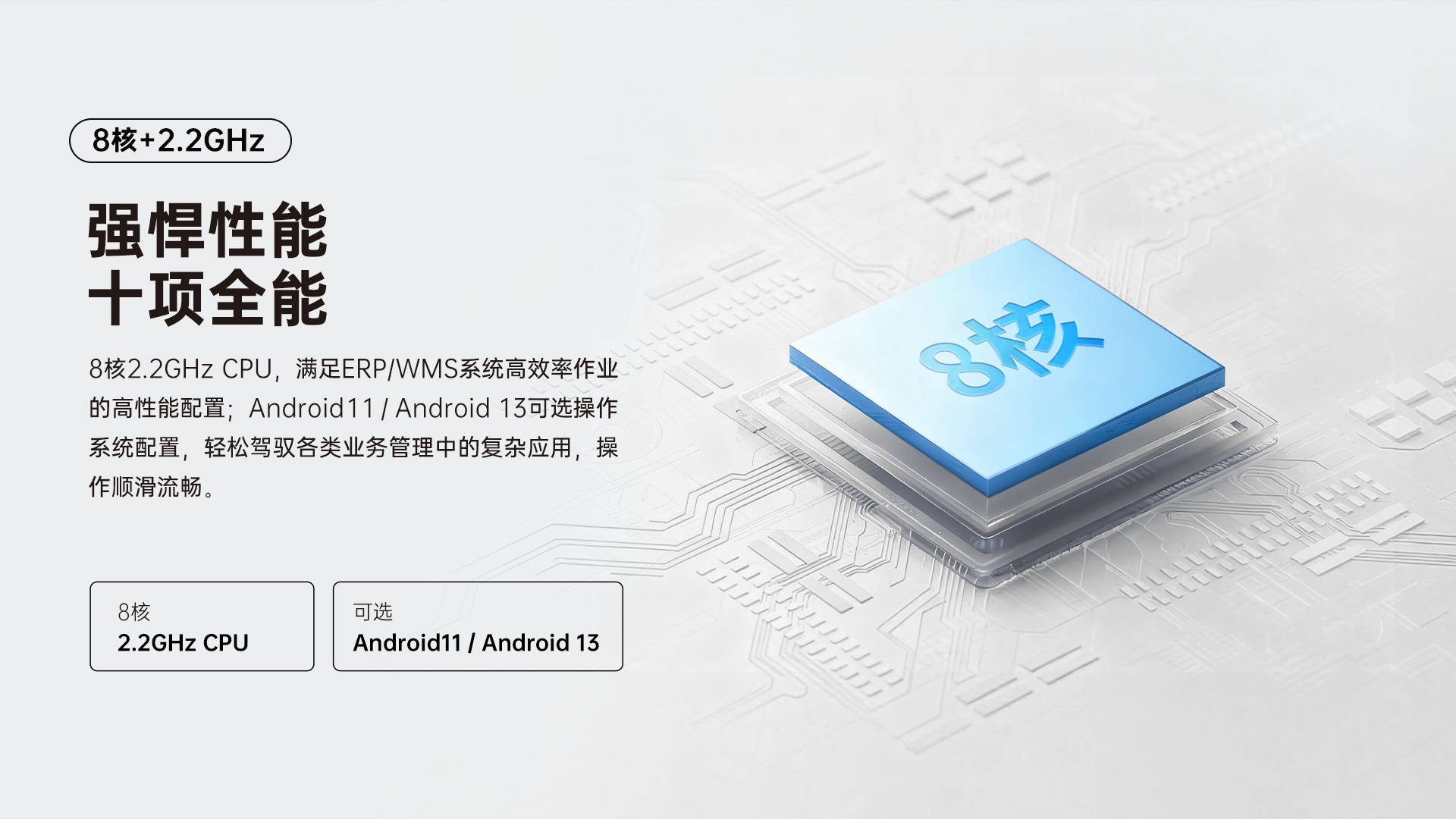 8核2.2GHz CPU,满足ERP/WMS系统高效率作业的高性能配置;Android11 / Android 13可选操作系统配置,轻松驾驭各类业务管理中的复杂应用,操作顺滑流畅。