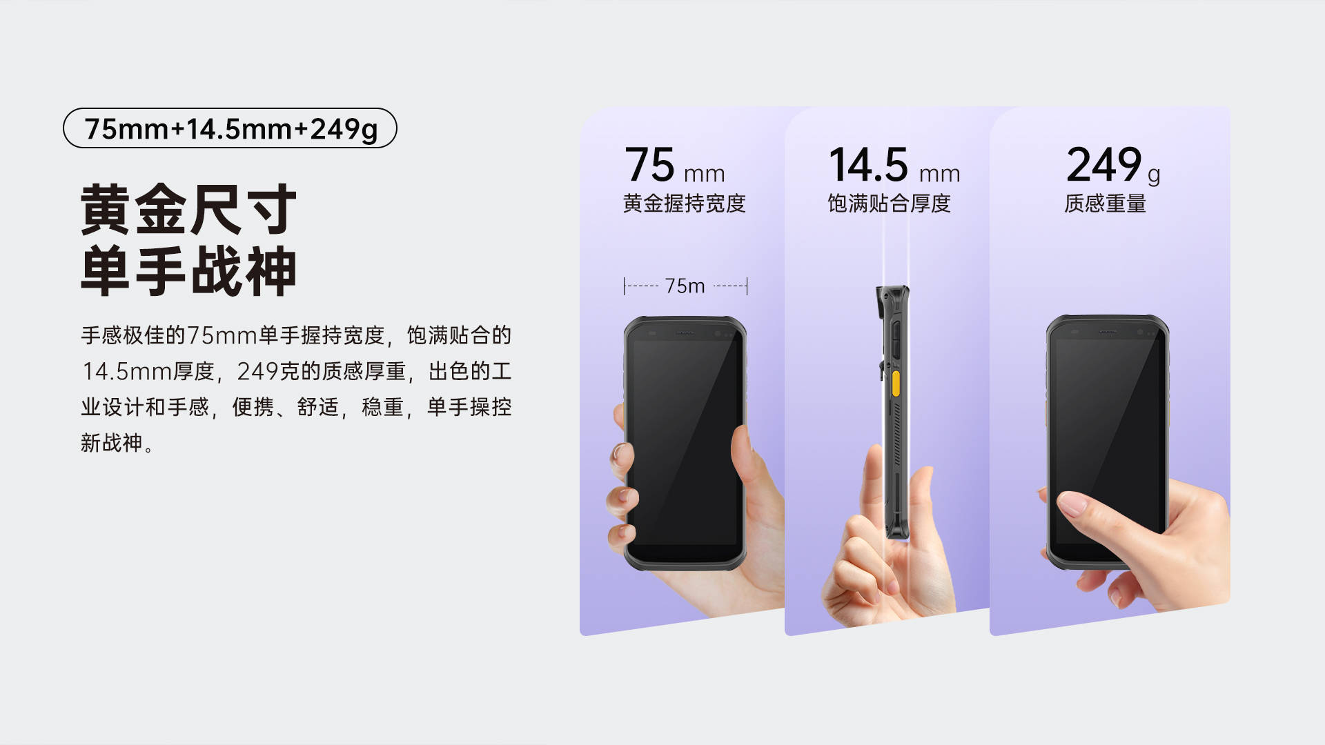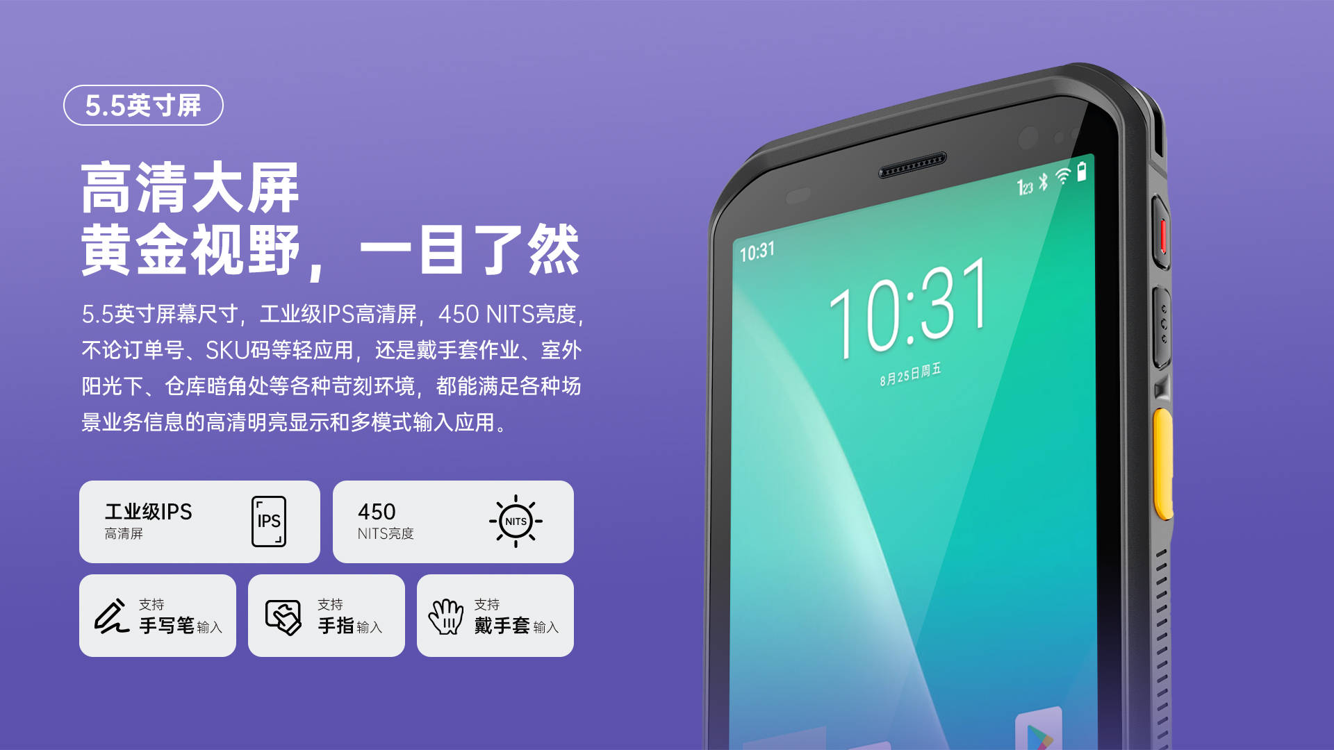 5.5英寸屏幕尺寸,工业级IPS高清屏,450 NITS亮度,不论订单号、SKU码等轻应用,还是戴手套作业、室外阳光下、仓库暗角处等各种苛刻环境,都能满足各种场景业务信息的高清明亮显示和多模式输入应用。