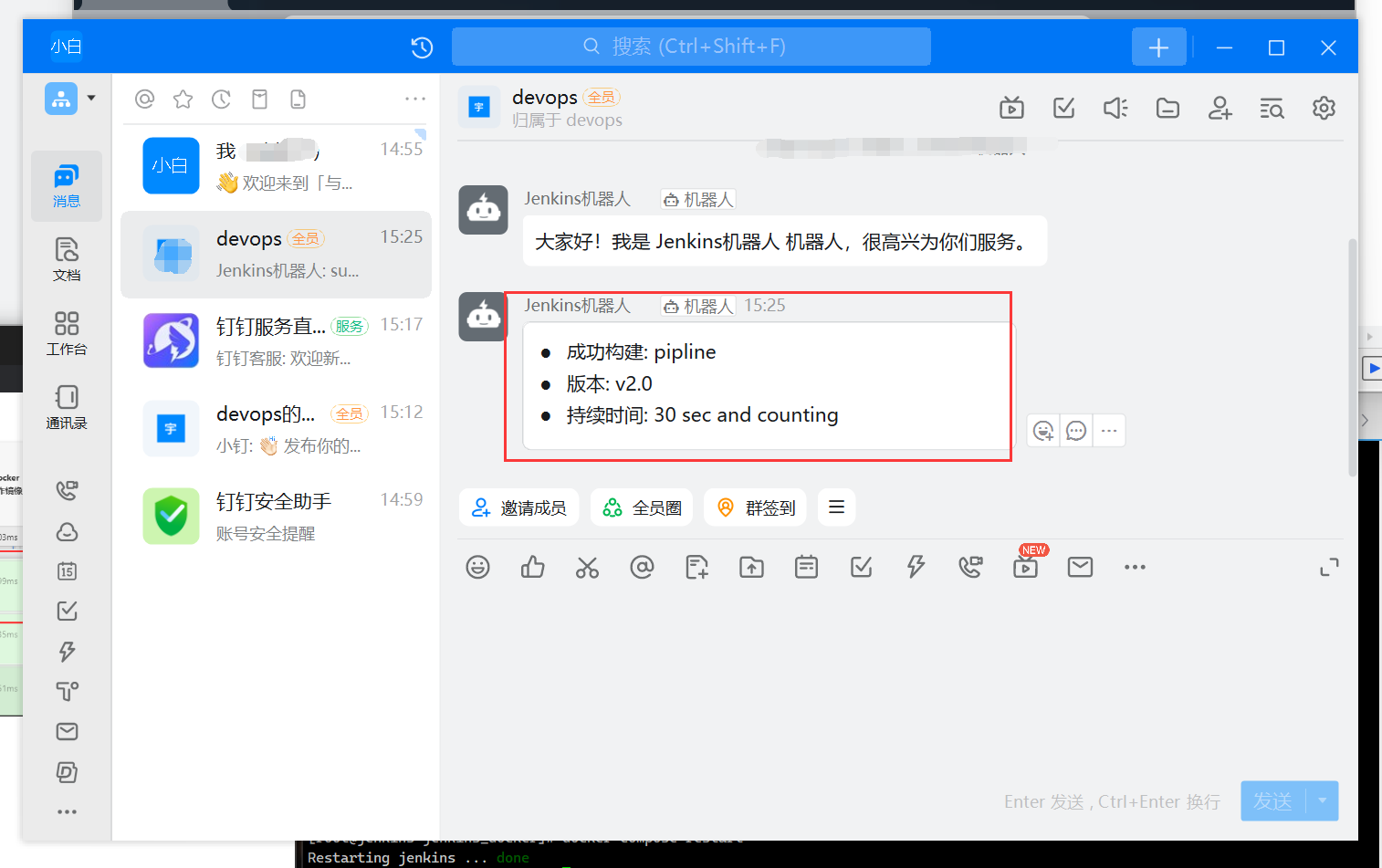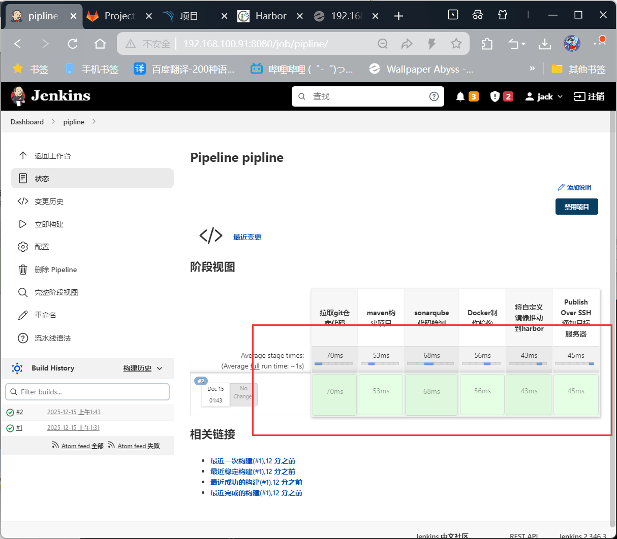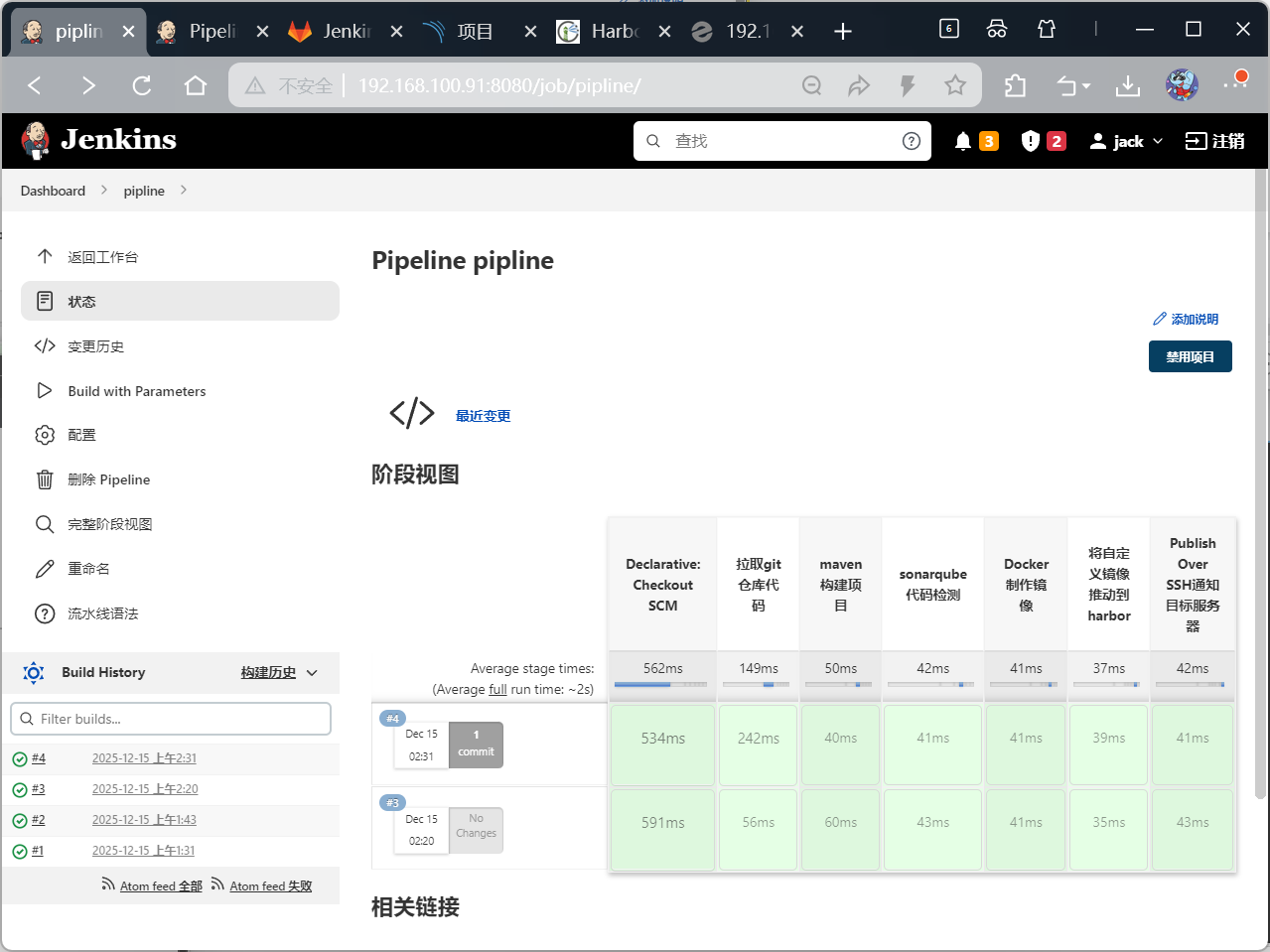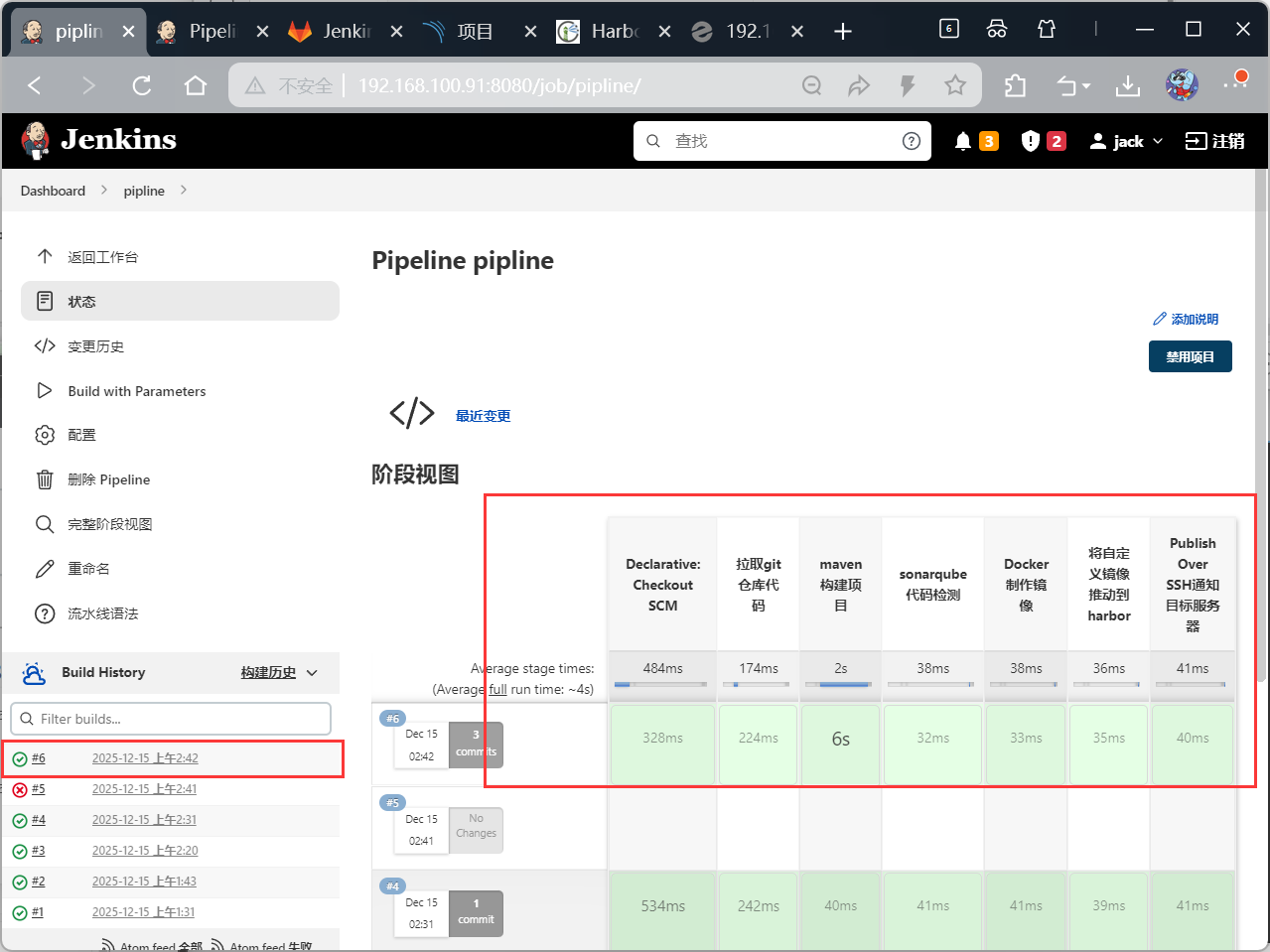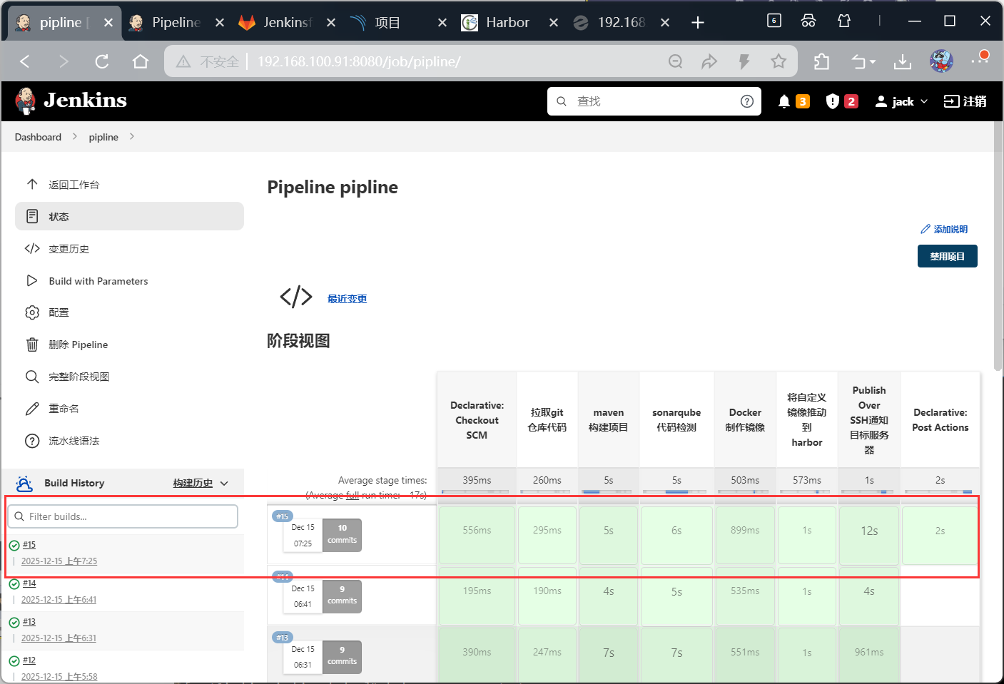 按照原来构建项目的流程,使用pipeline流水线进行分阶段的管理构建,并且构建后钉钉会 通知消息