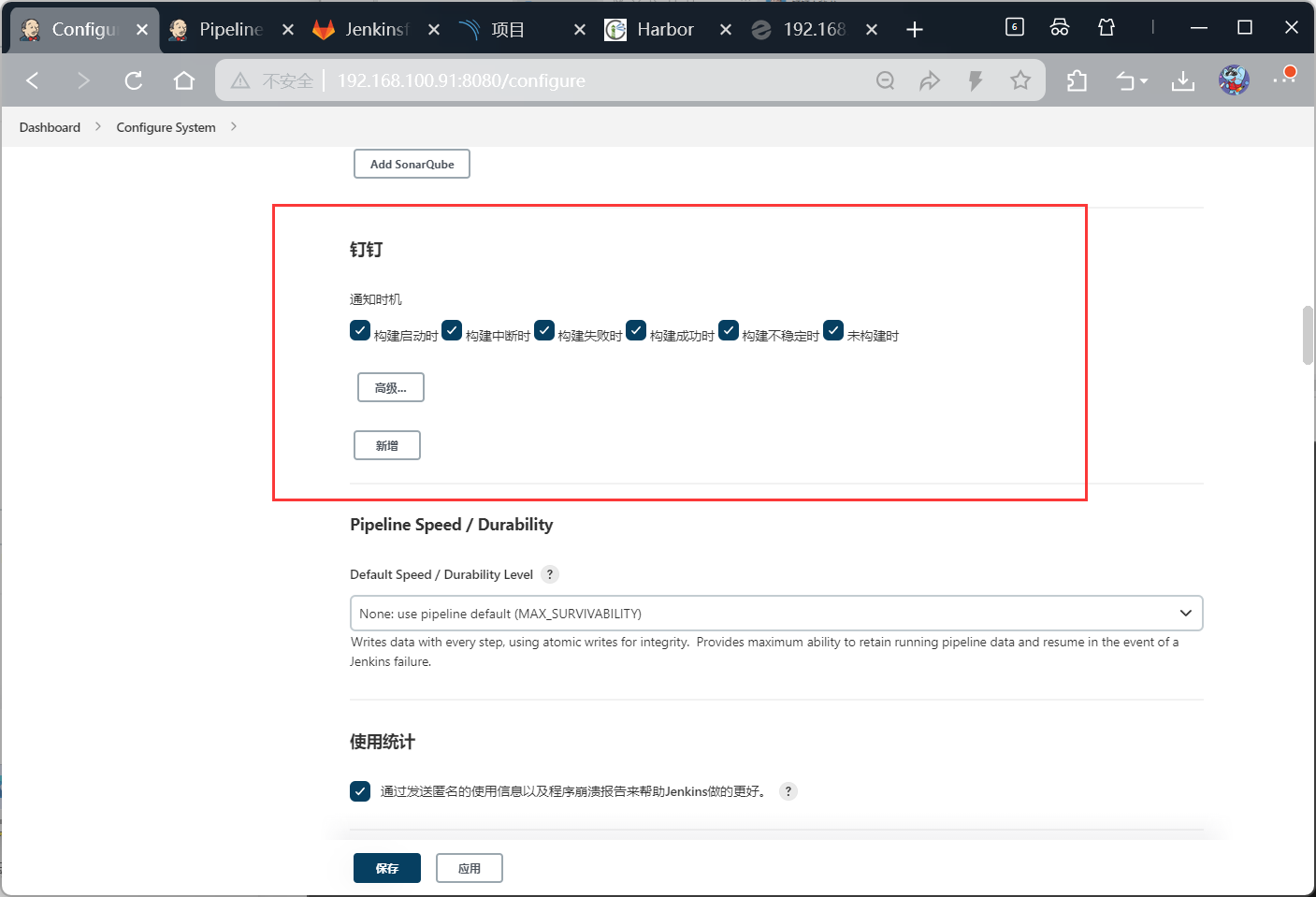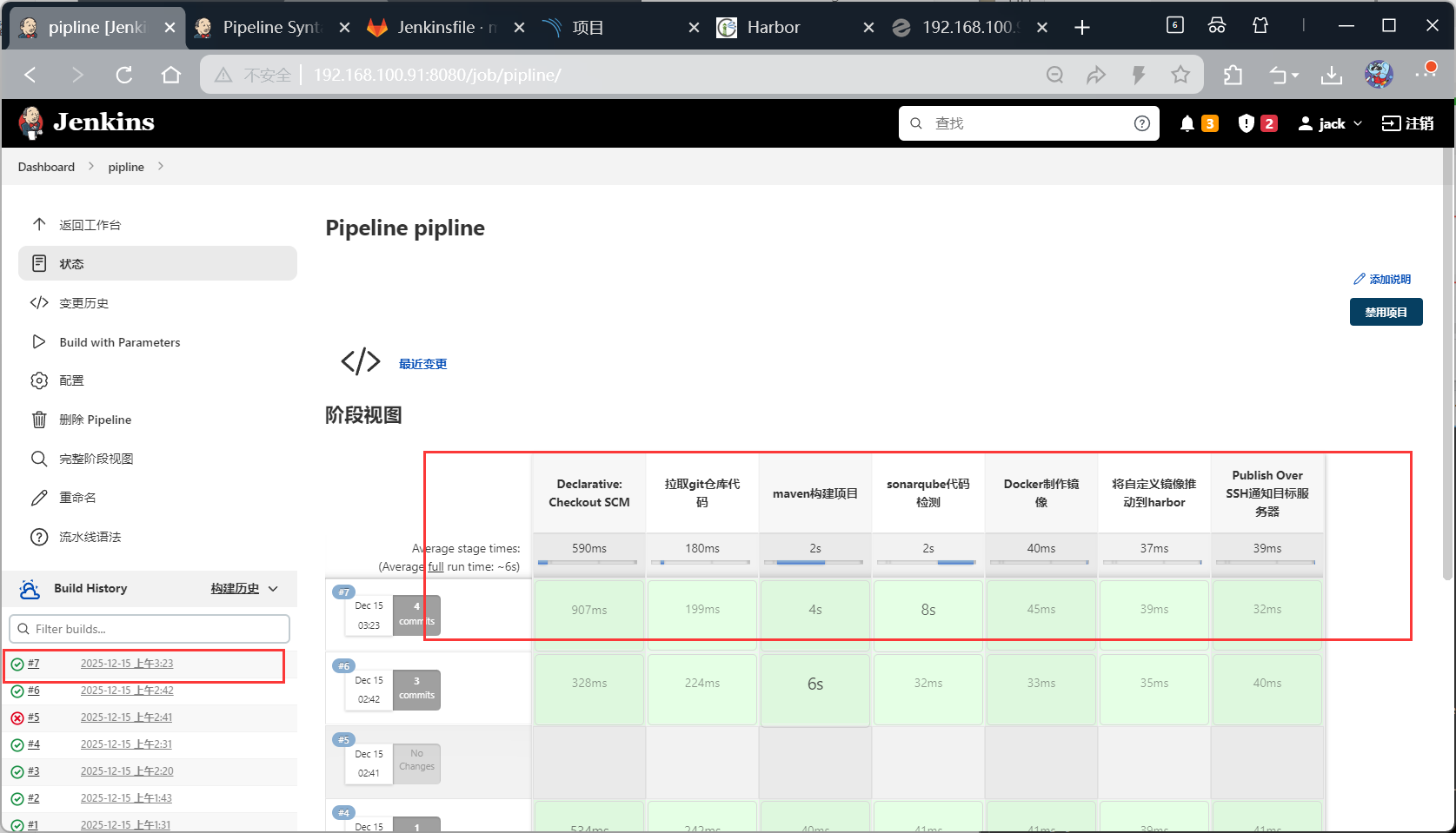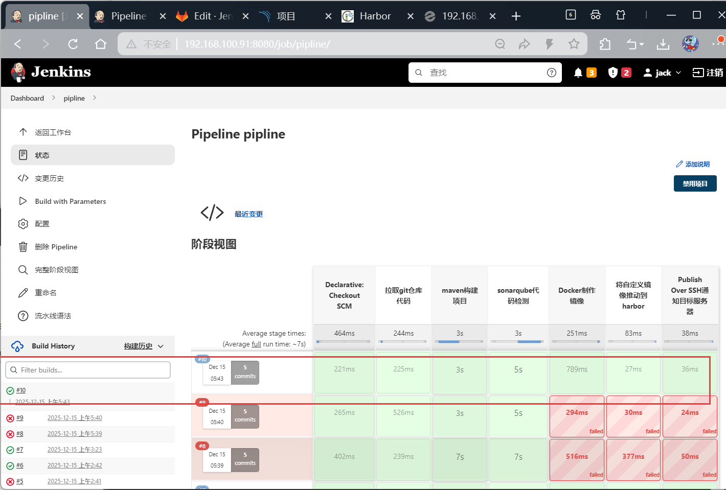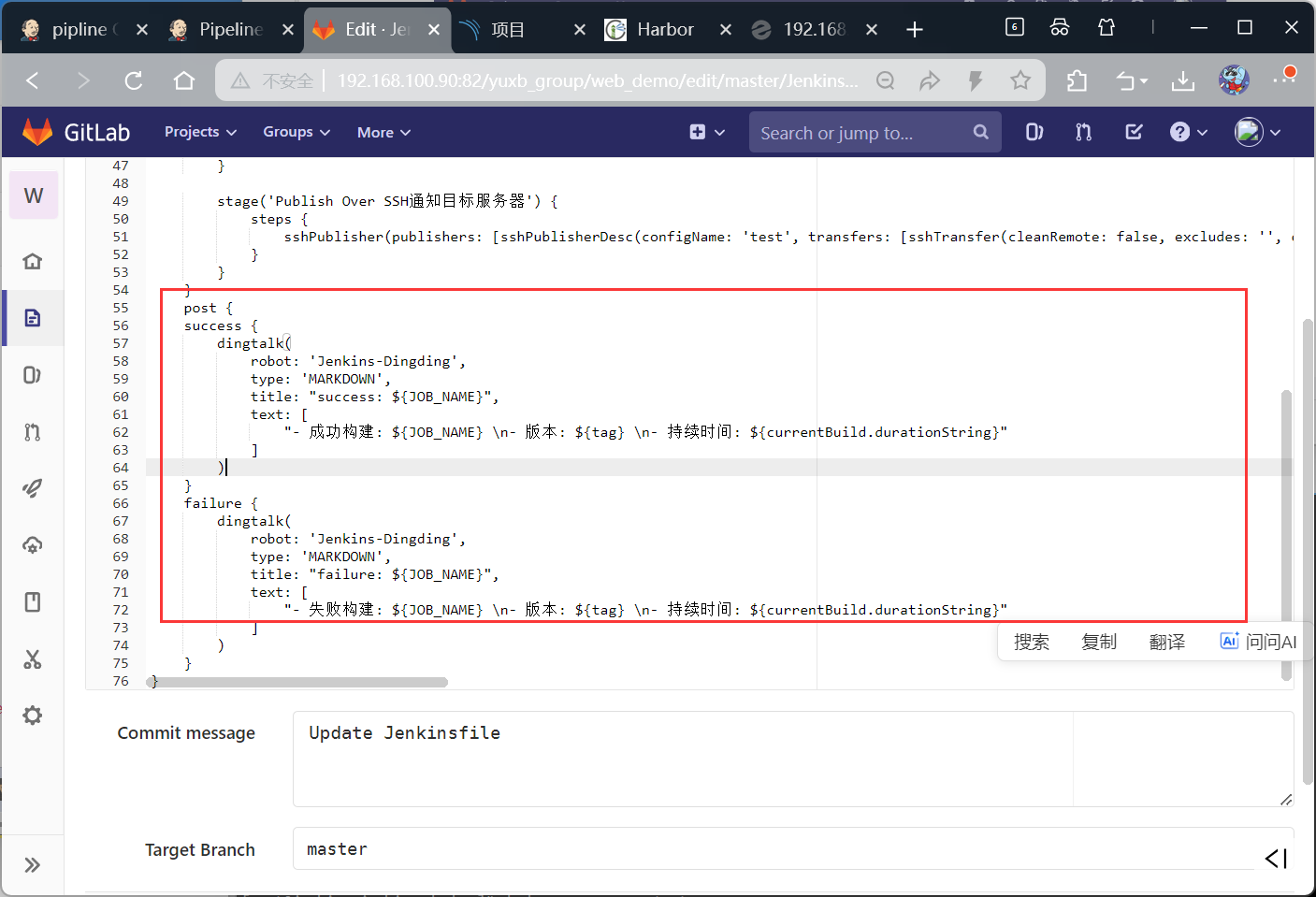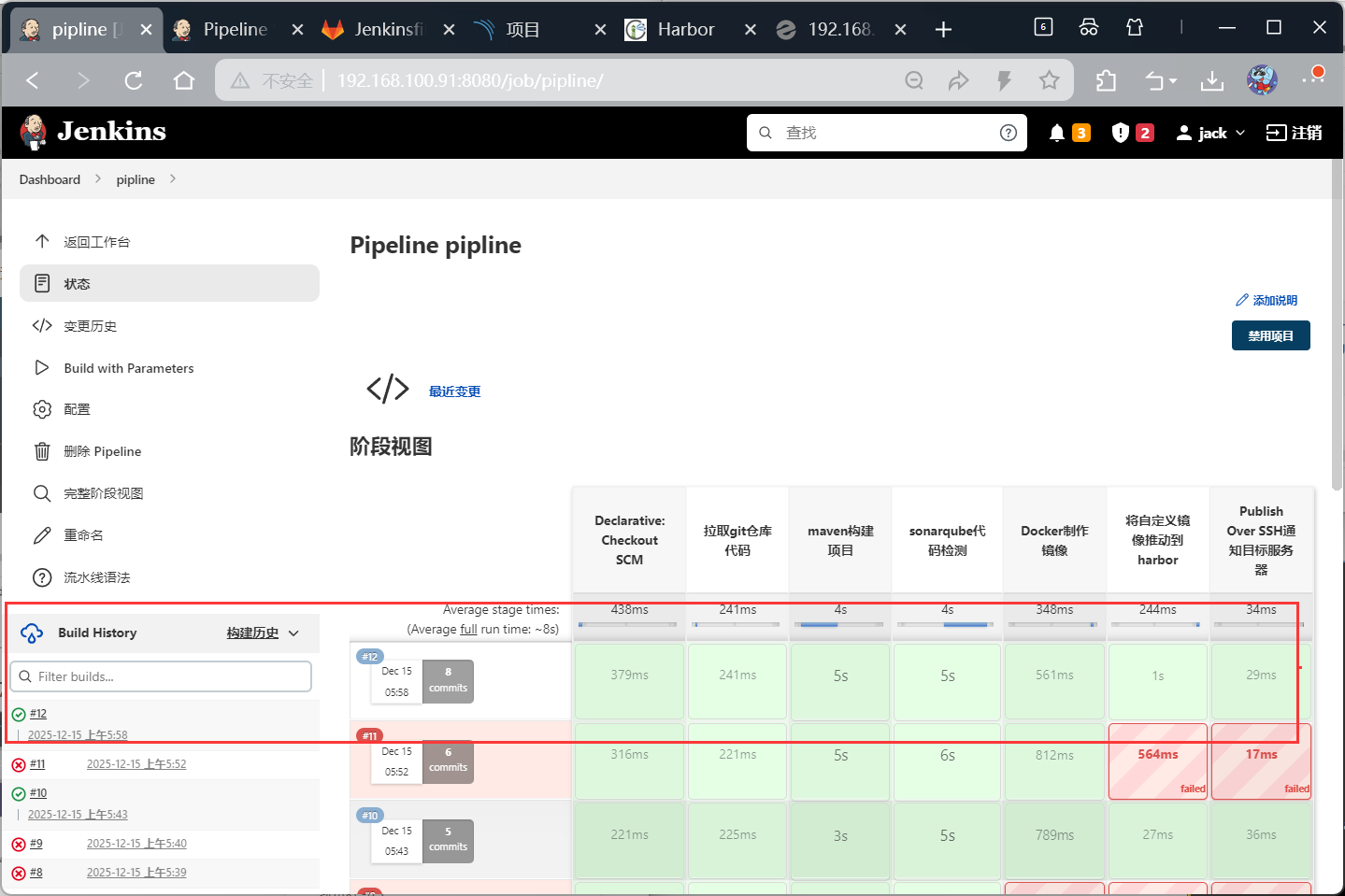 按照原来构建项目的流程,使用pipeline流水线进行分阶段的管理构建,并且构建后钉钉会 通知消息